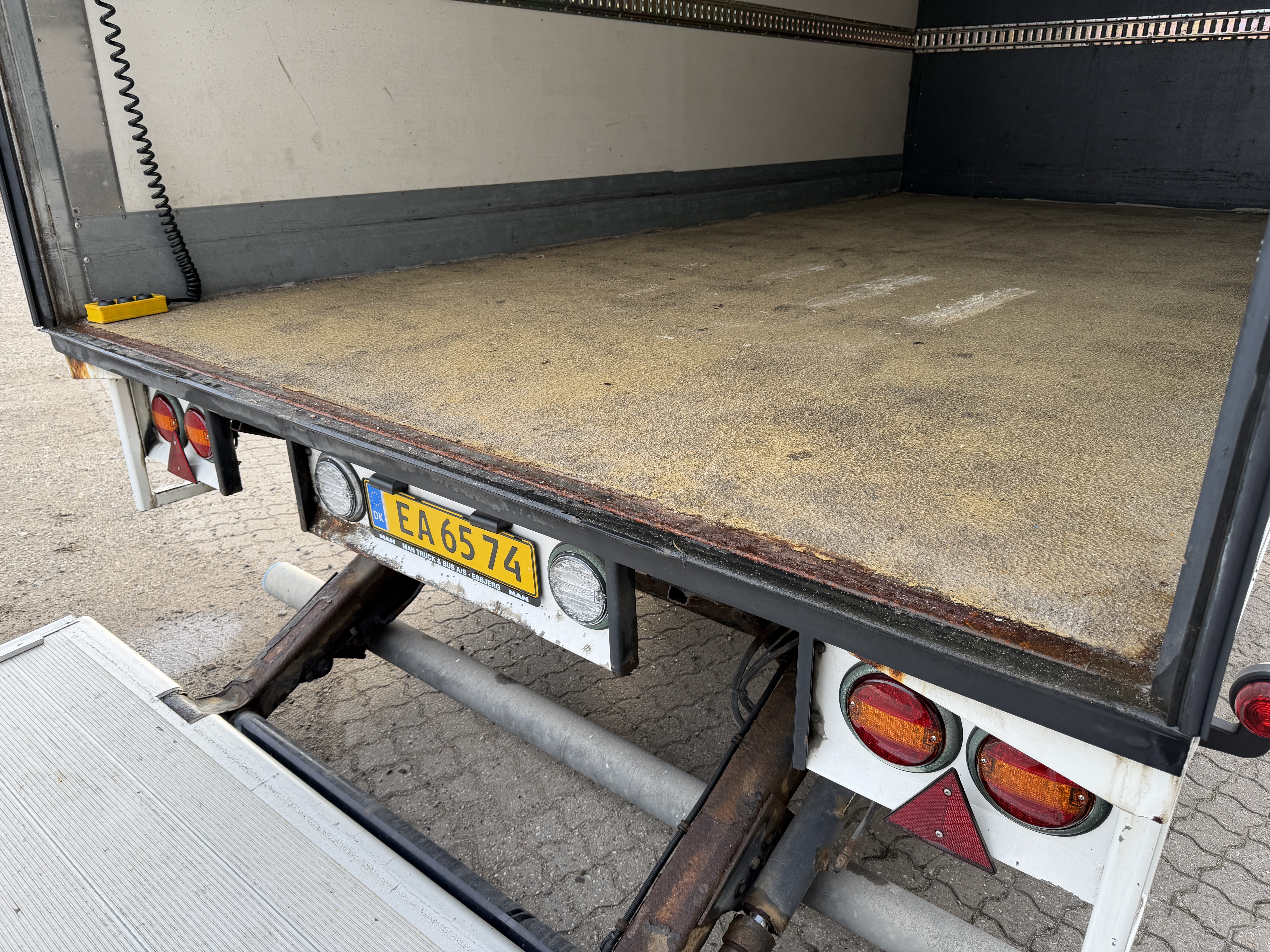 Liftpladen er en 2.000 mm alu-plade monteret på en HMF-lift med udvendigt betjeningspanel, og liften kan drives af en separat batteristation. Lifteftersyn er udført i juni 2025.