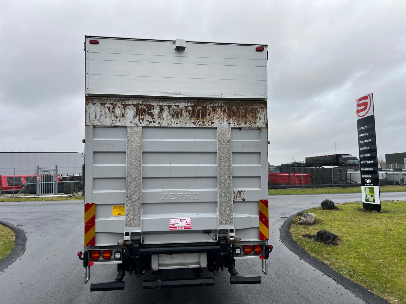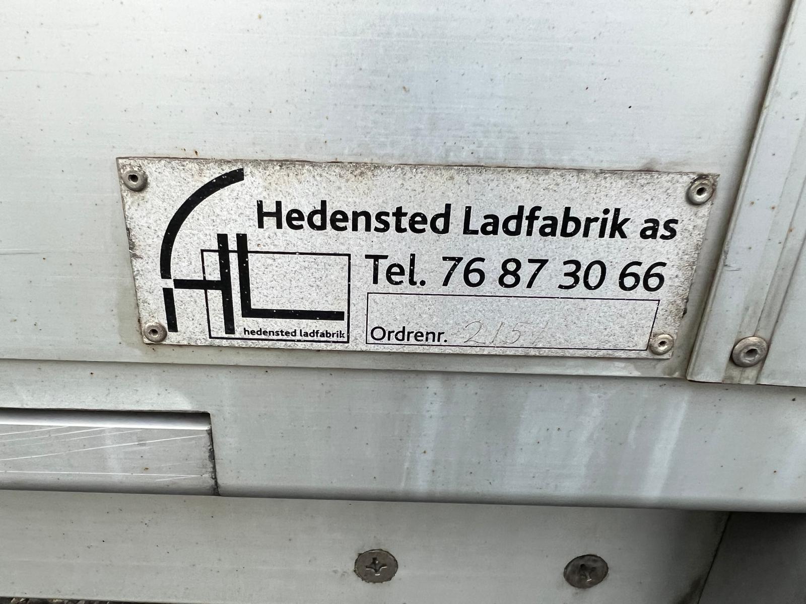 Denne Scania P280 B 4x2 NB er opbygget med et 20 pallers alu‑gardinfragtlad fra Hedensted Ladfabrik og er udstyret med en 2.500 kg fjernbetjent Zepro‑lift med 2.000 mm liftplade. Laddet har indvendige mål på L 8100 x B 2480 x H 2800 mm, med lysmål i bagrammen på 2750 mm og 2650 mm i siderne. Der er presenningstag, sidedør i venstre side (1000 x 2000 mm) samt pakkelem i højre side.