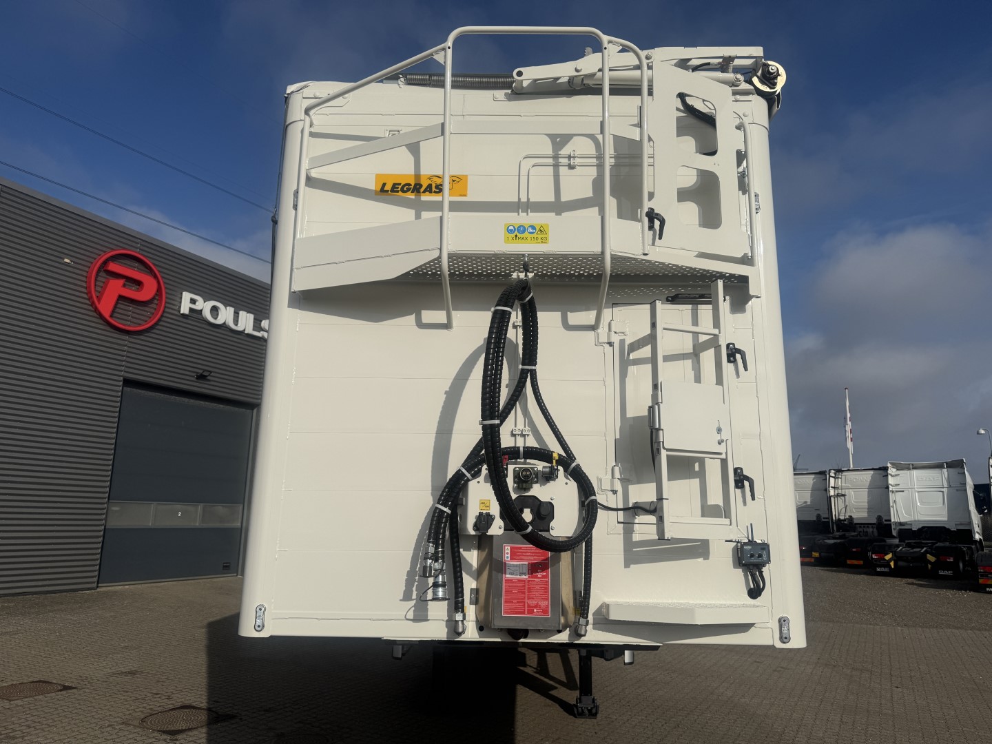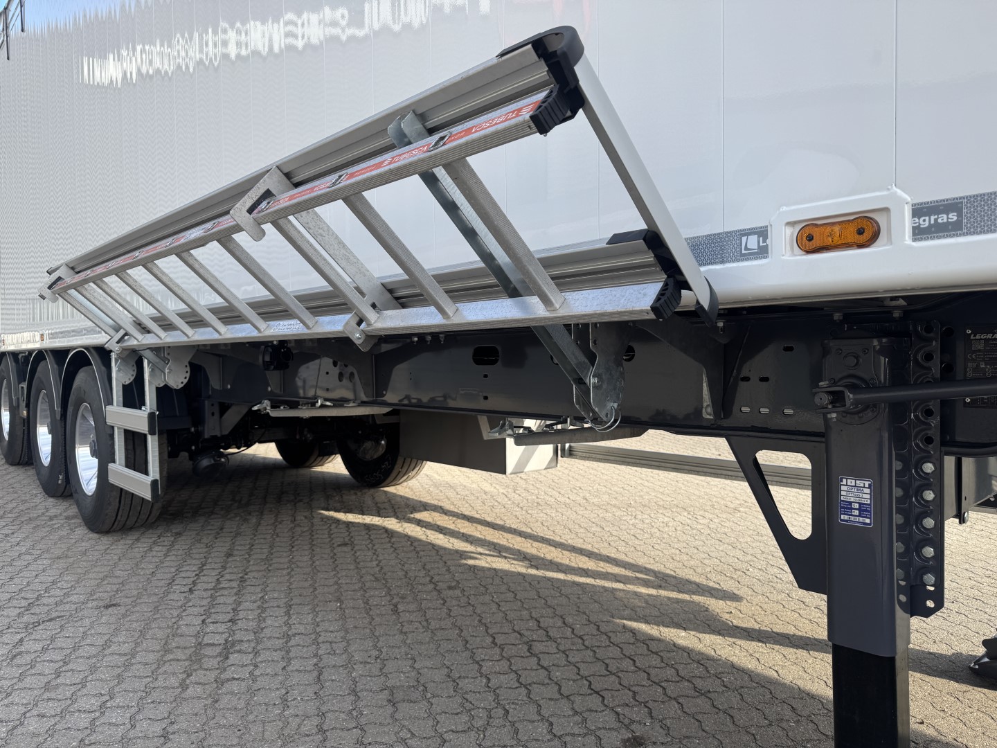 Denne LEGRAS 3-aks 91,8m3 walkingfloor trailer, er udstyret med en EcoTop automatpresenning og hydraulisk løft af overlæggeren bagpå. Den har BPW aksler med tromlebremser, liftaksel på aksel 1 og medstyrende aksel 3.