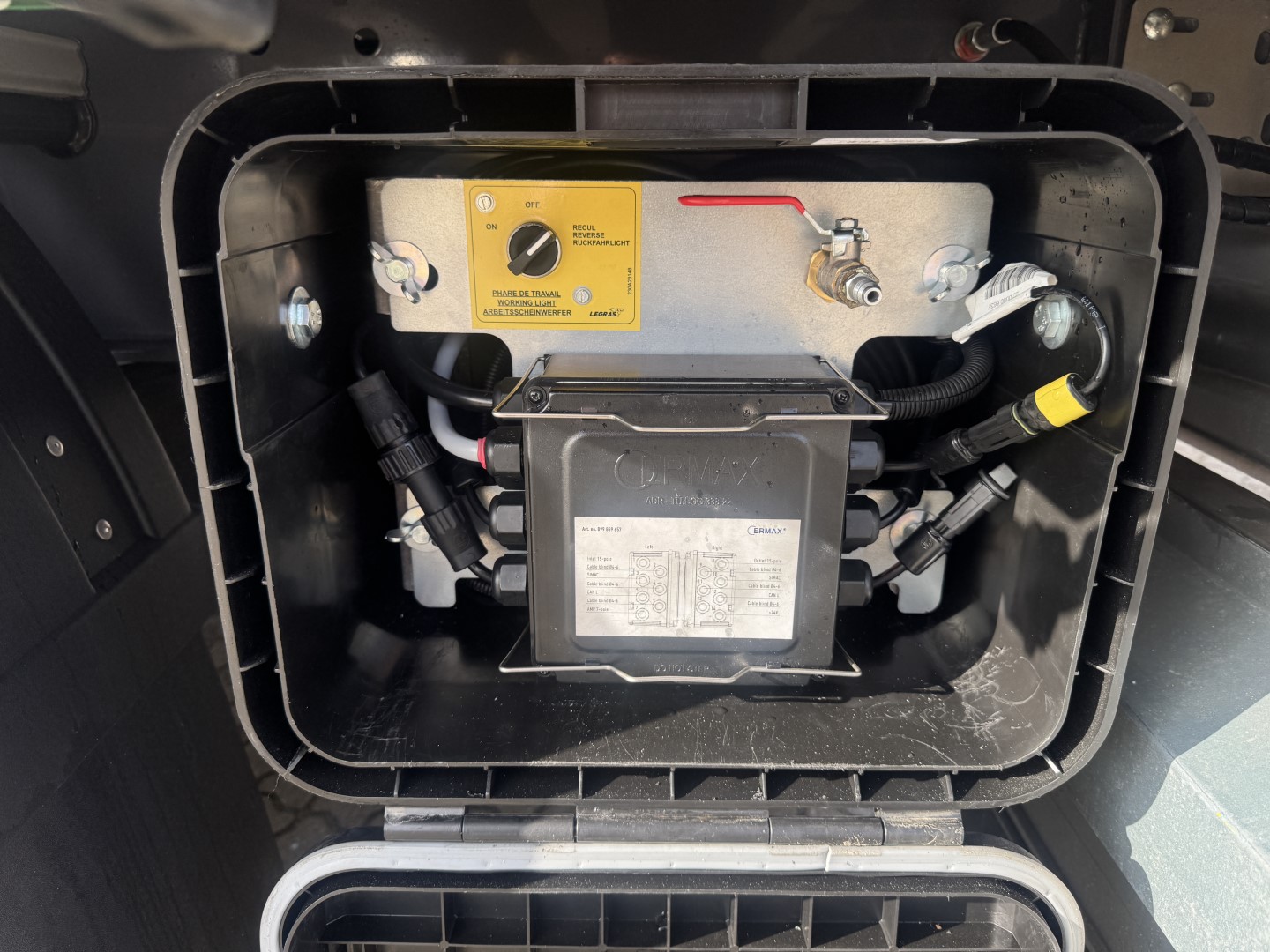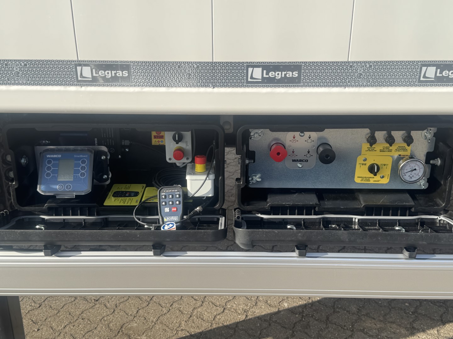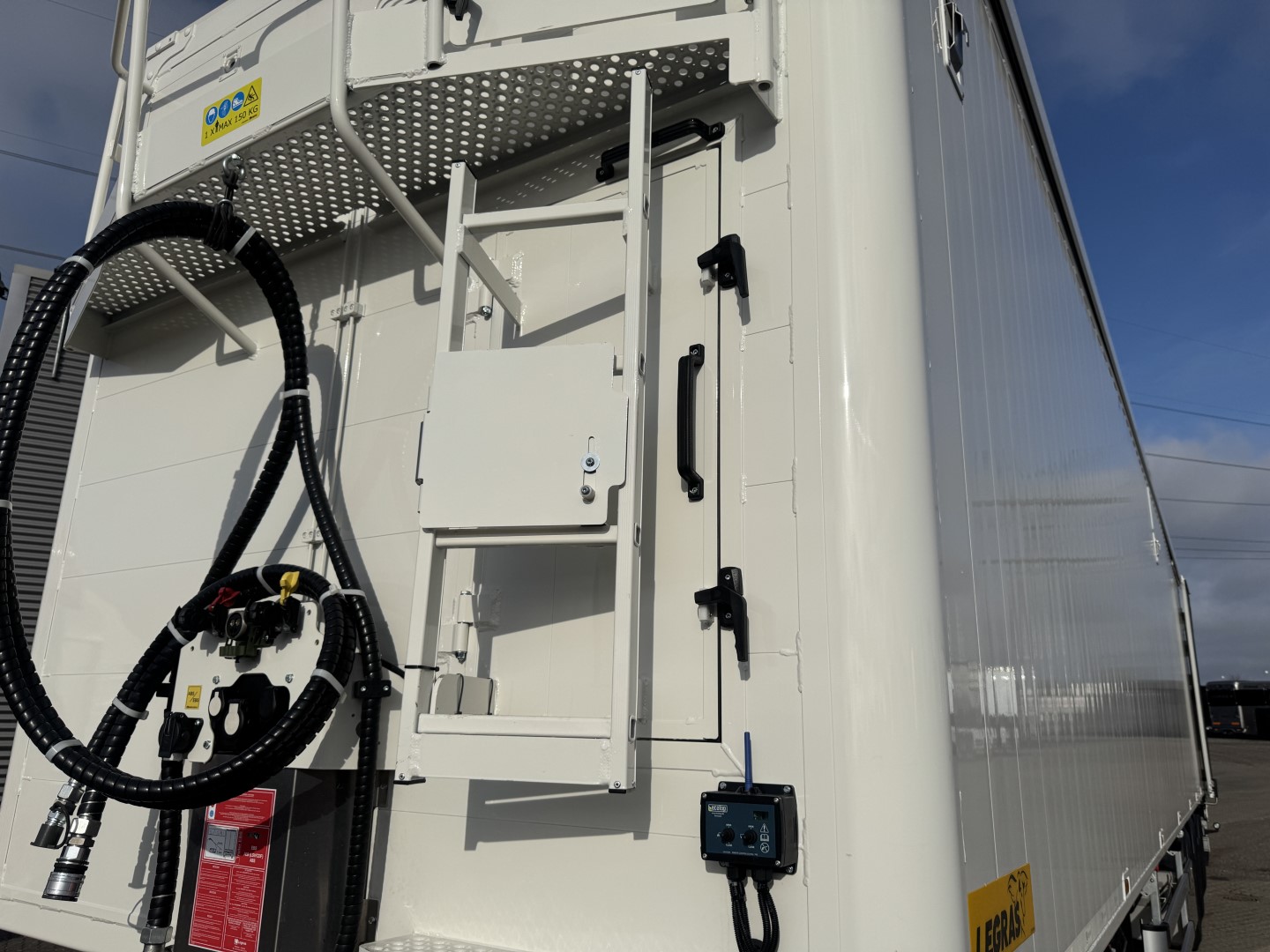 Alle hydrauliske funktioner kan betjenes trådløst via en fjernbetjening. Køretøjet er forberedt til gulvpresenning (ekskl. selve presenningen), og der er en dør i fronten samt et rustfrit værktøjsskab. Alle betjeningsventiler er indbygget i kasser, og el-samleboksen er ligeledes beskyttet i kasse.