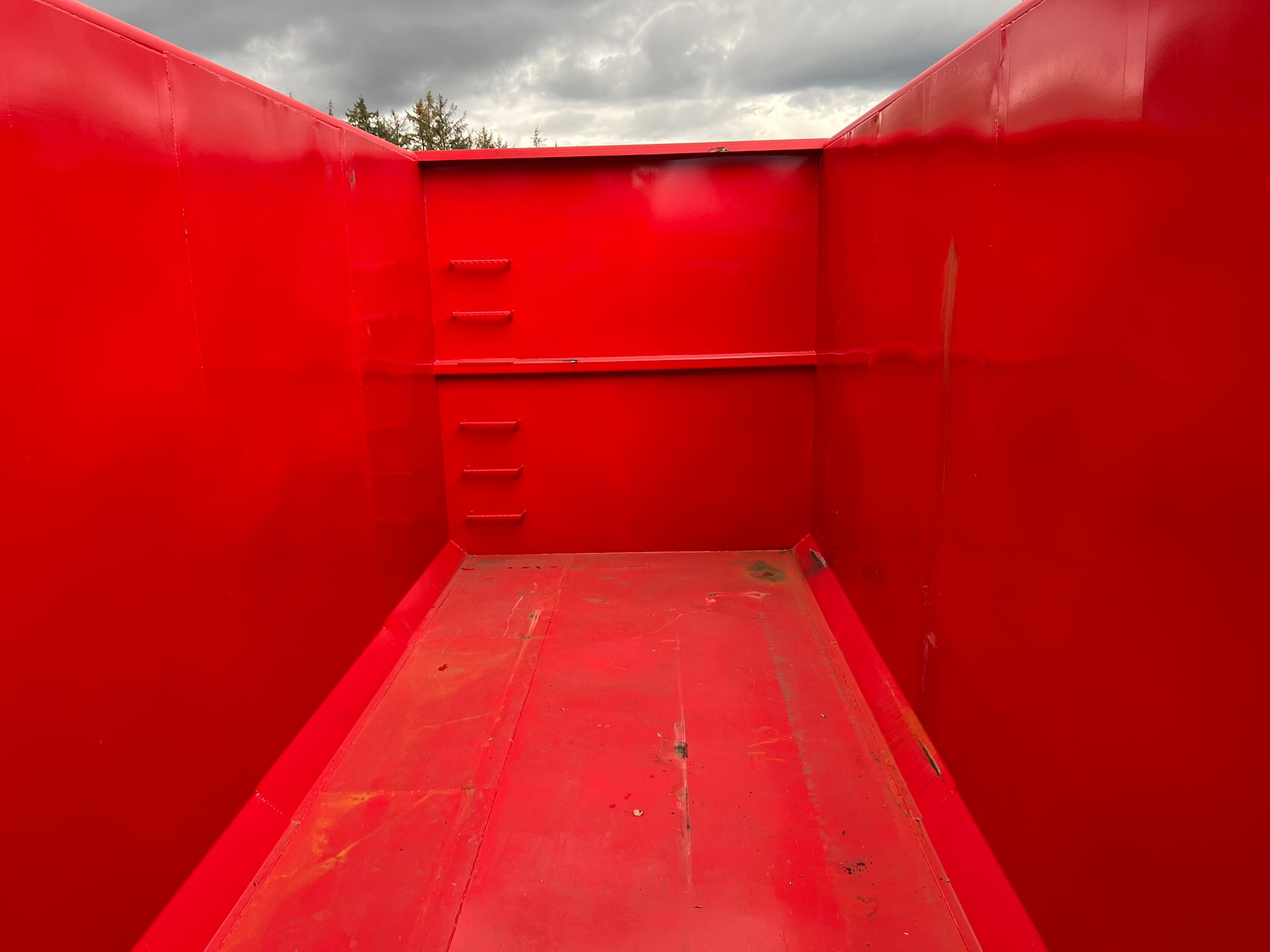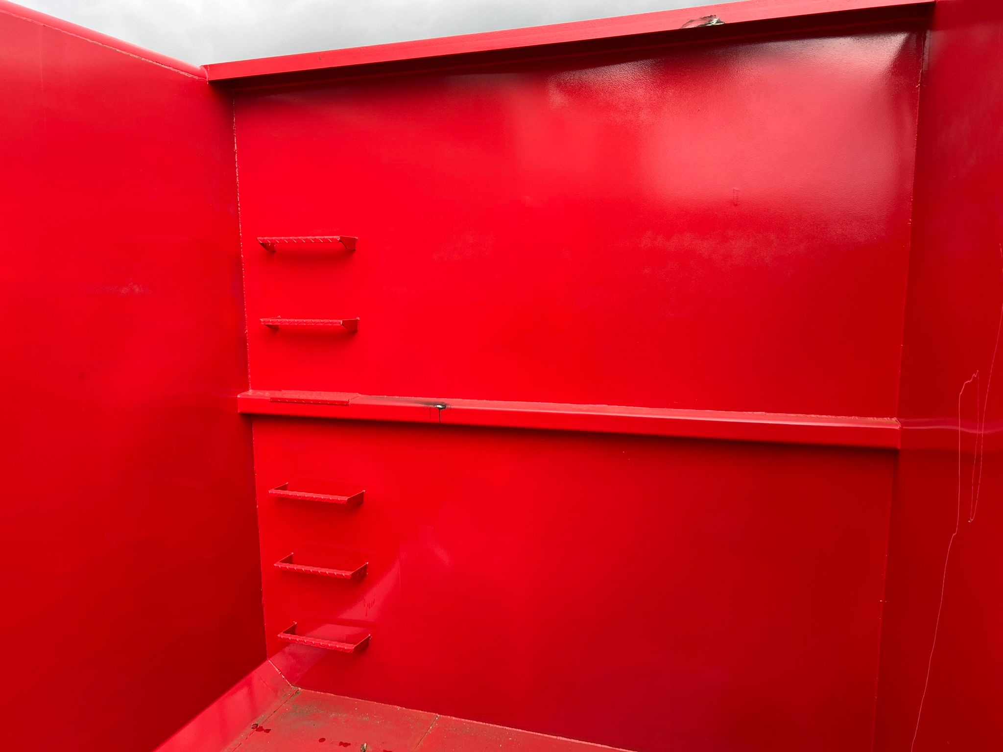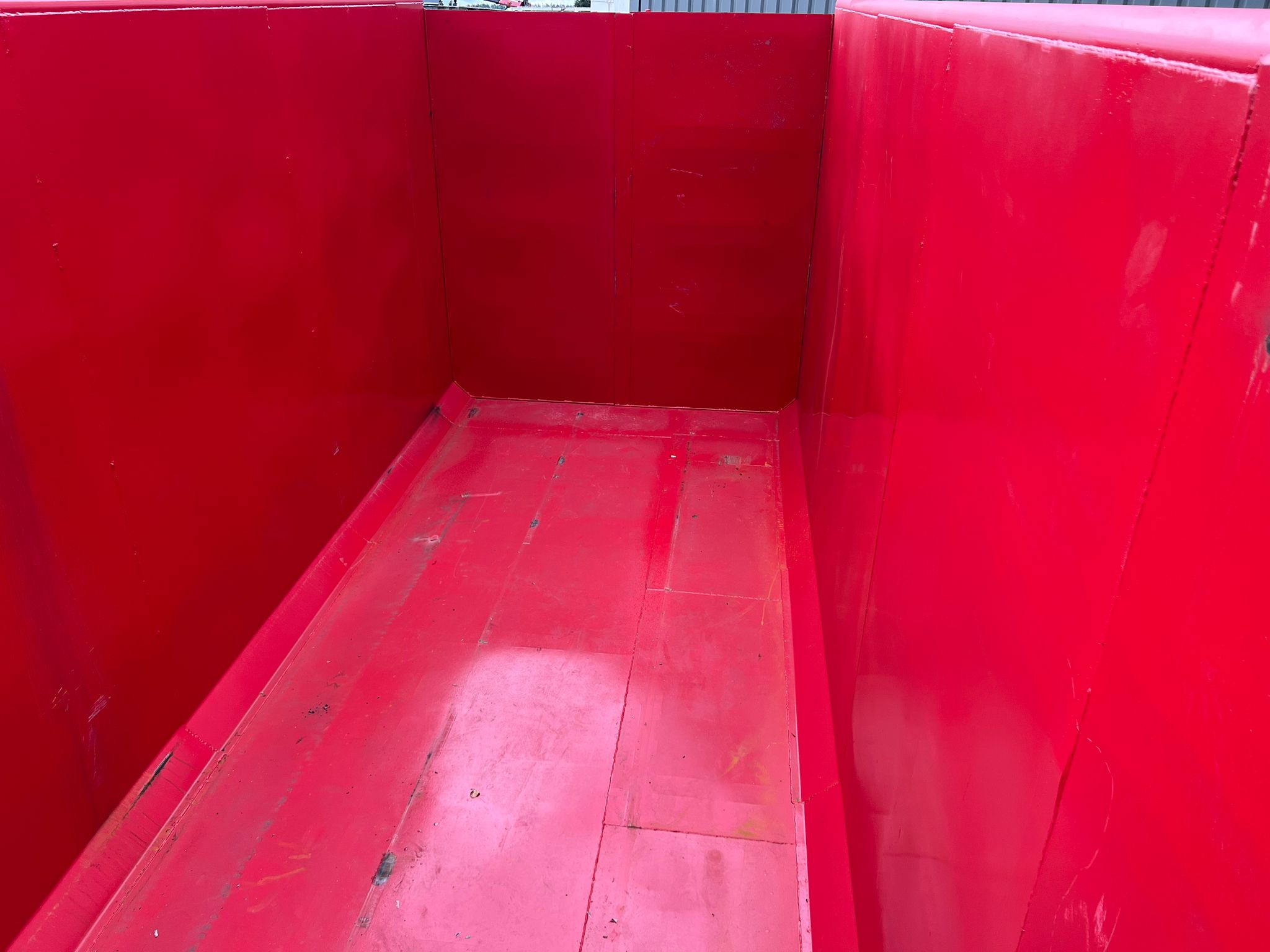 indv. lænde 6500 mm - udvendig total længde 6800 mm - indv højde 2500 mm bredde 2350 mm - 5 mm. bund og 3 mm i siderne - optræk til krog og wire hejs - Sidehængte bagdøre - Lakeret i RAL 3001 signalrød (Farve kan ændres frem til 2 uger før levering) - 750 mm. i vange afstand - kraftig surrringsstang lang yderside - diverse kroge øverste til til net - fodtrin på forsmæk + indv i kassen