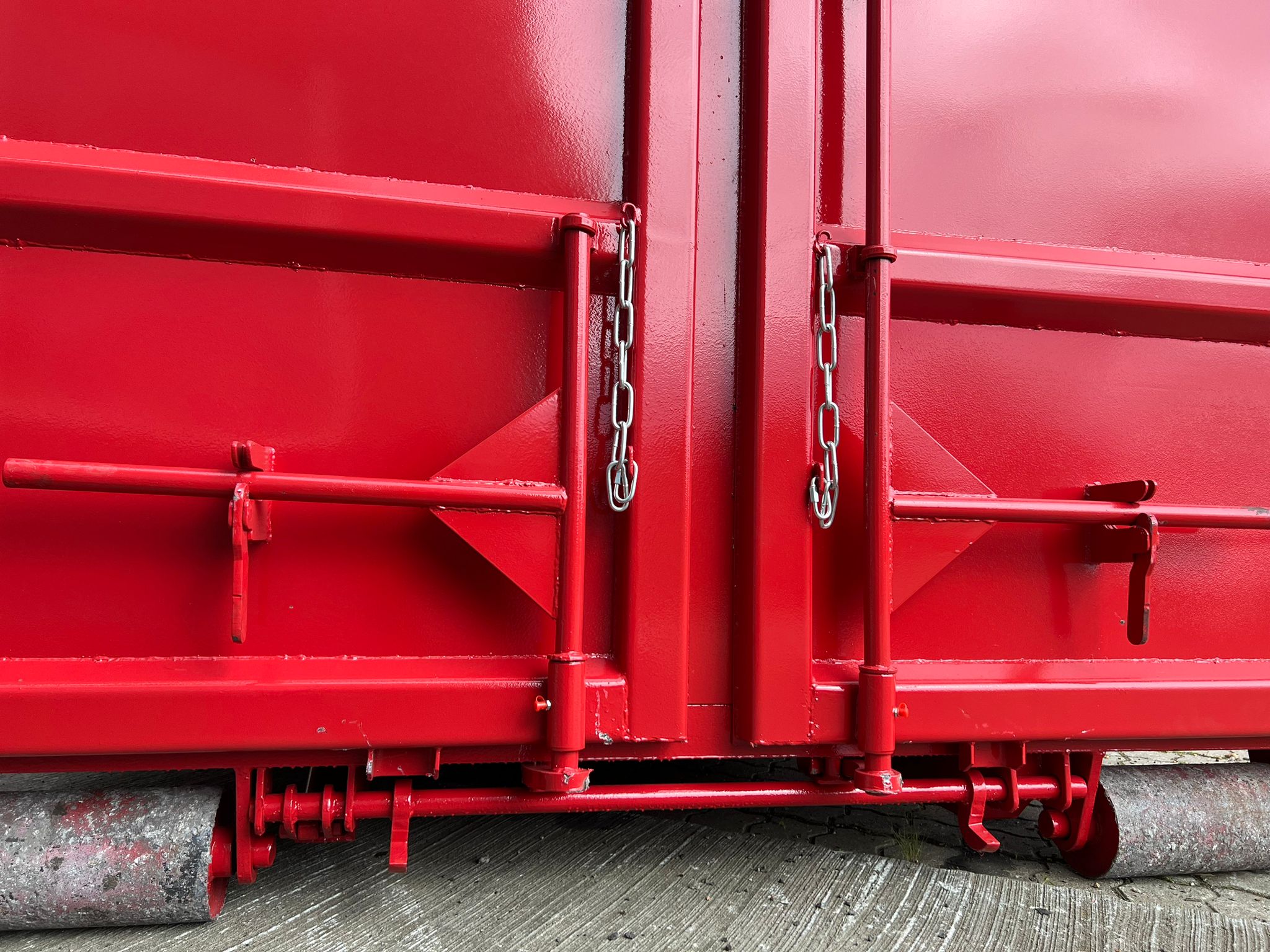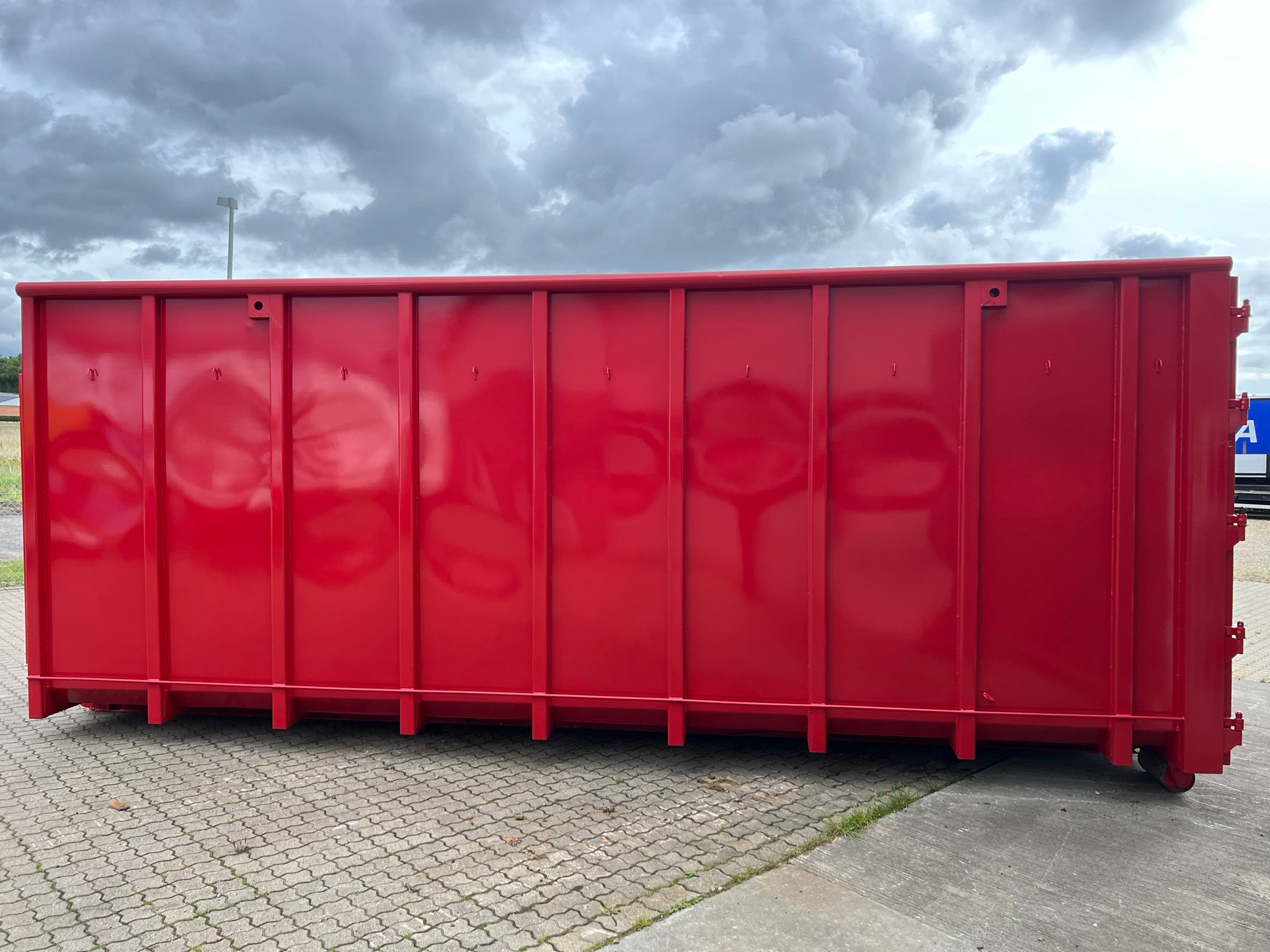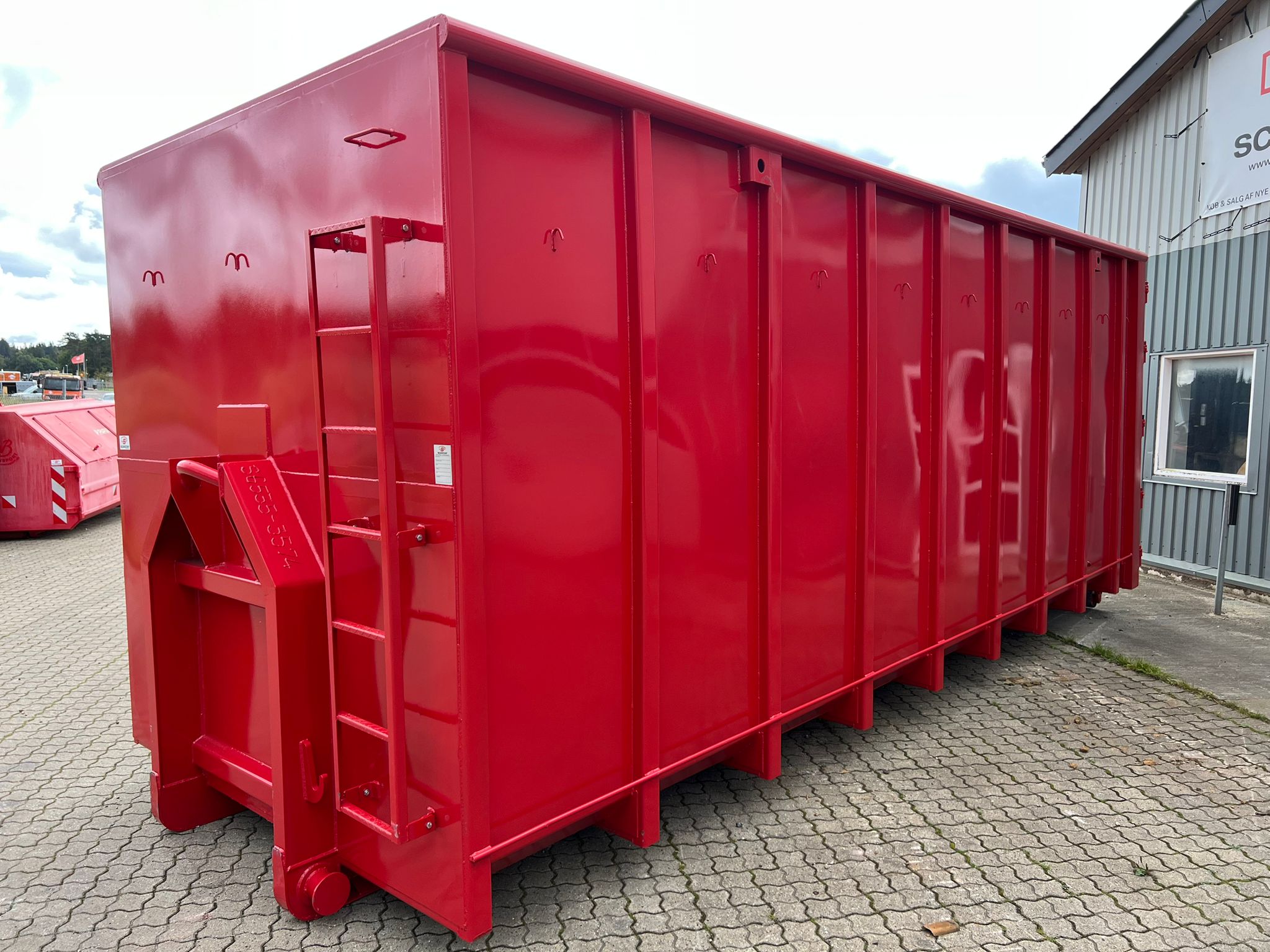 indv. lænde 6500 mm - udvendig total længde 6800 mm - indv højde 2500 mm bredde 2350 mm - 5 mm. bund og 3 mm i siderne - optræk til krog og wire hejs - Sidehængte bagdøre - Lakeret i RAL 3001 signalrød (Farve kan ændres frem til 2 uger før levering) - 750 mm. i vange afstand - kraftig surrringsstang lang yderside - diverse kroge øverste til til net - fodtrin på forsmæk + indv i kassen