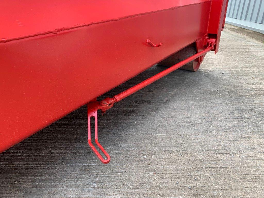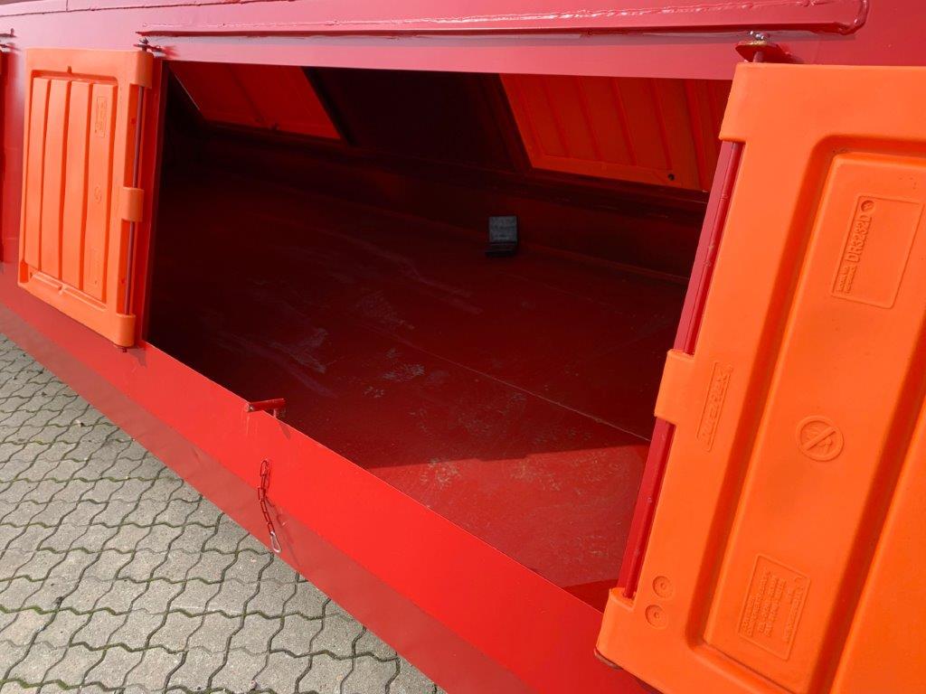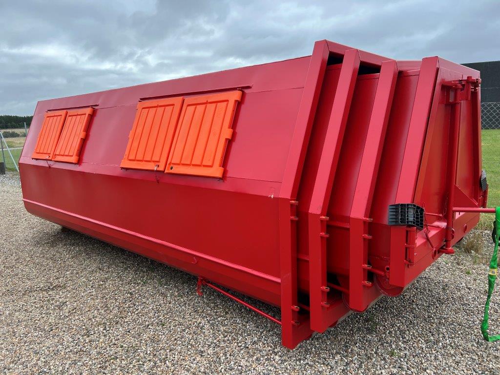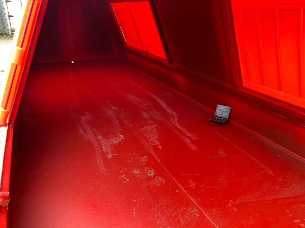 Opbygget med følgende indv. mål: L 6000 x B 1940 x H 1350 mm (13m3) - 2 x 2 stk. plastiklåg i hver side 1550 x 750 - Optræk for både krog + wire - 3 mm bund / sider - Leveres i RAL 3001 (Postrød)