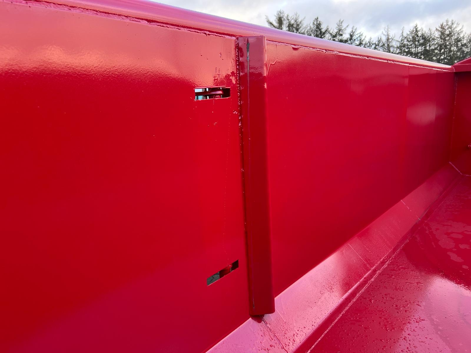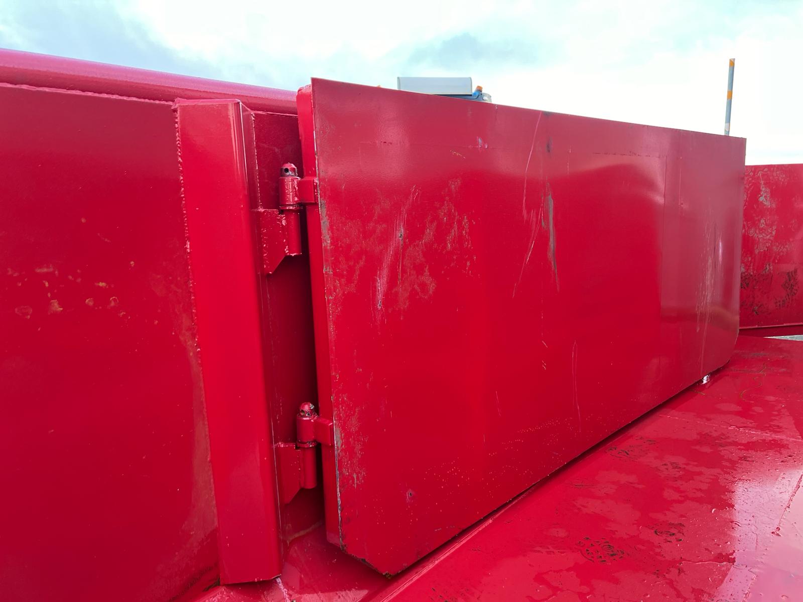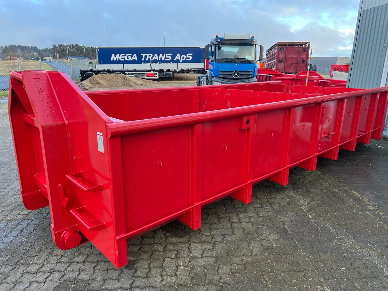5 mm. bund og 3 mm. sider i S235 stål - Beslag til krog og wire - Sidehængt bagdøre - Lakeret i RAL 3001 Rød (Farve kan Ændres frem til 2 uger før levering) - 750 mm. i vangeafstand - Surringsstang lang yderside - Trin på forsmæk.