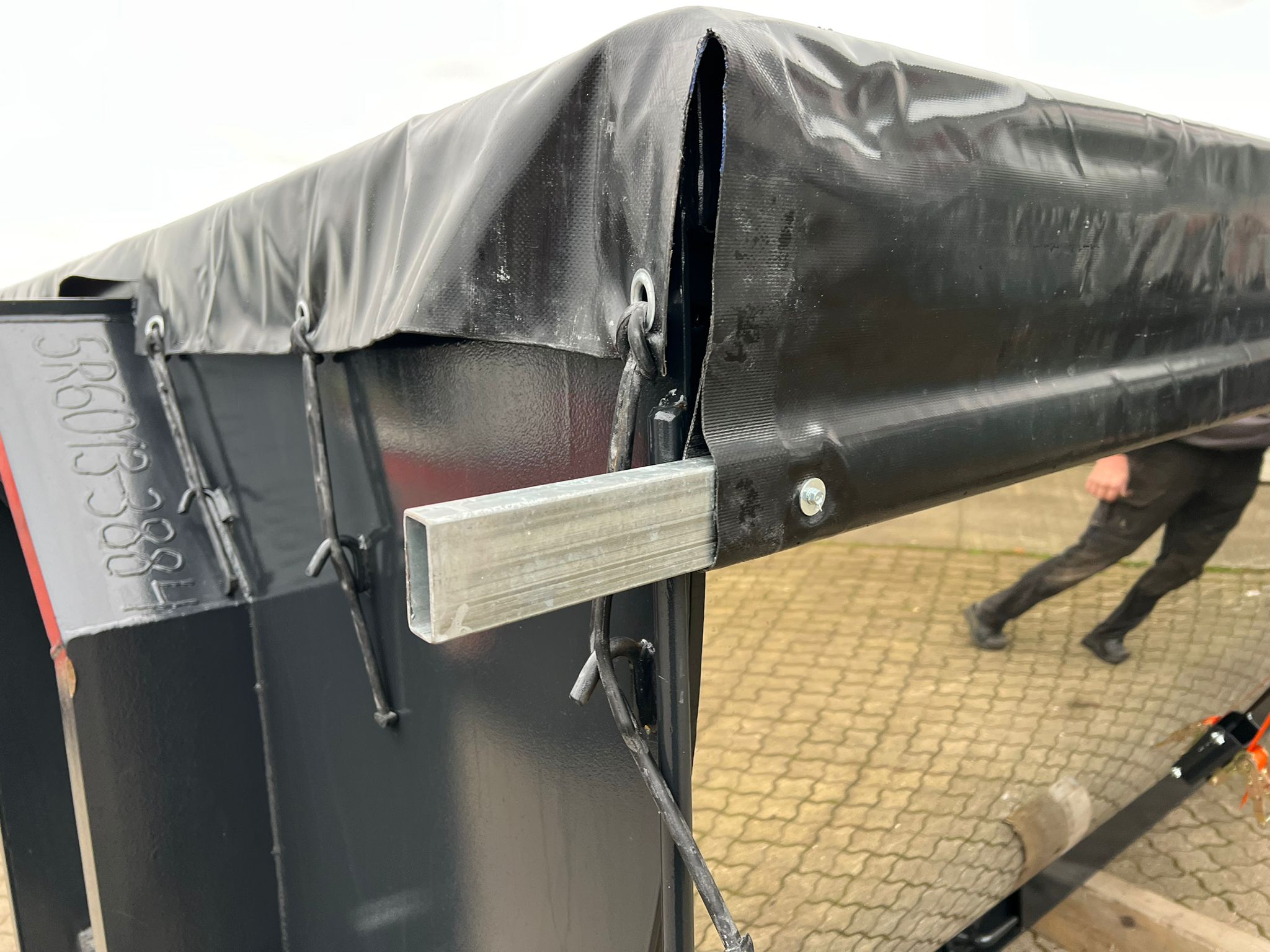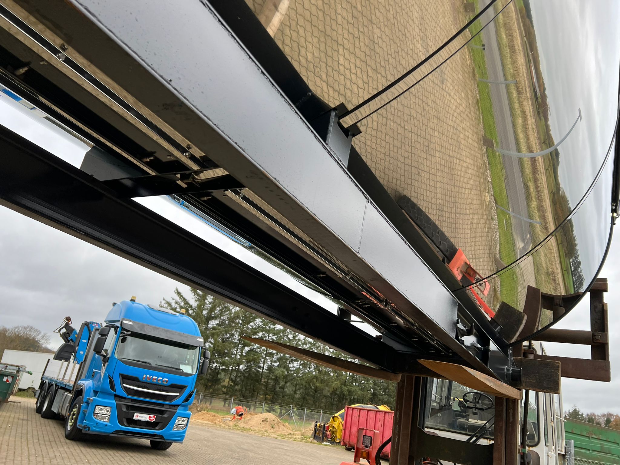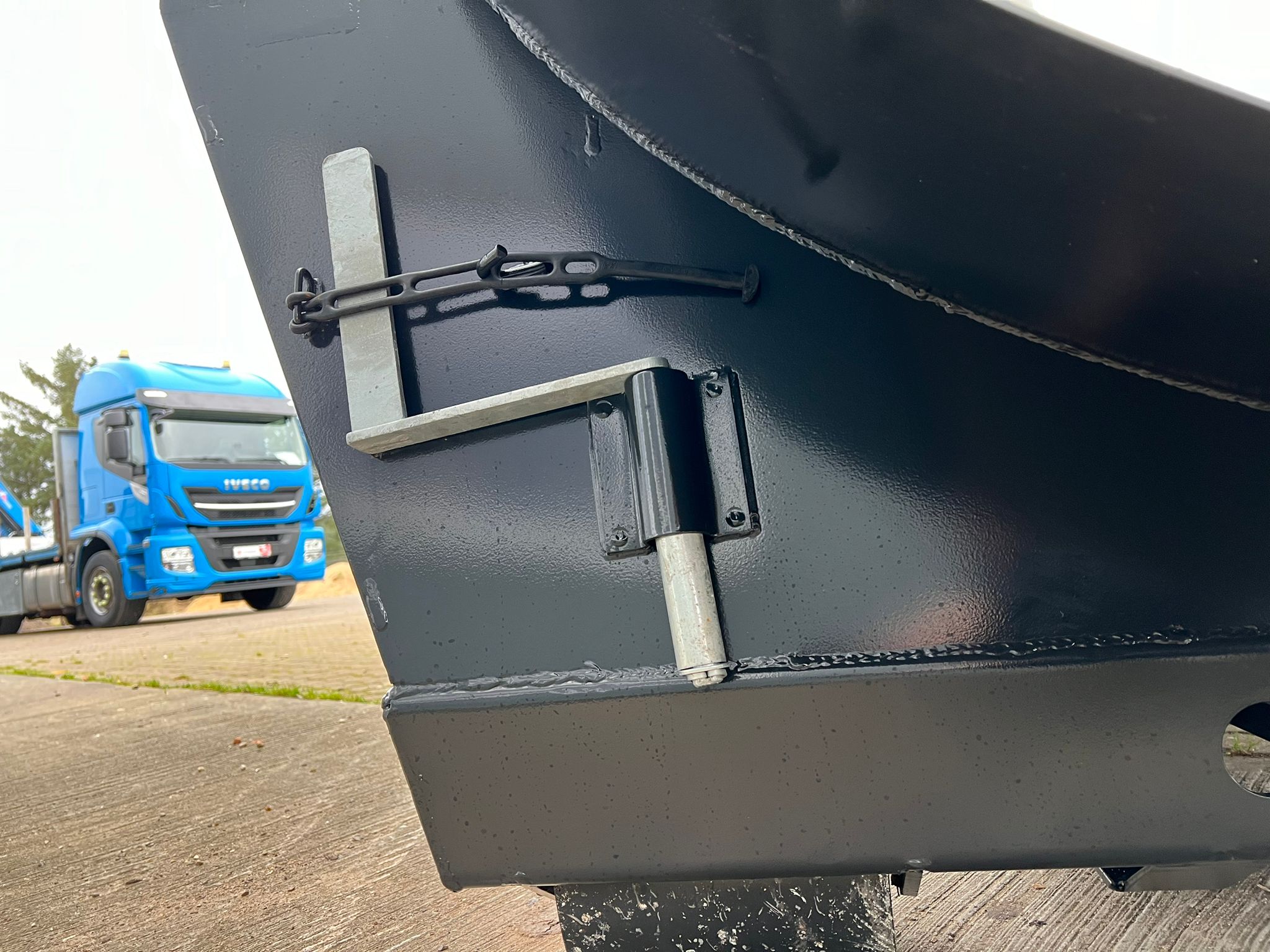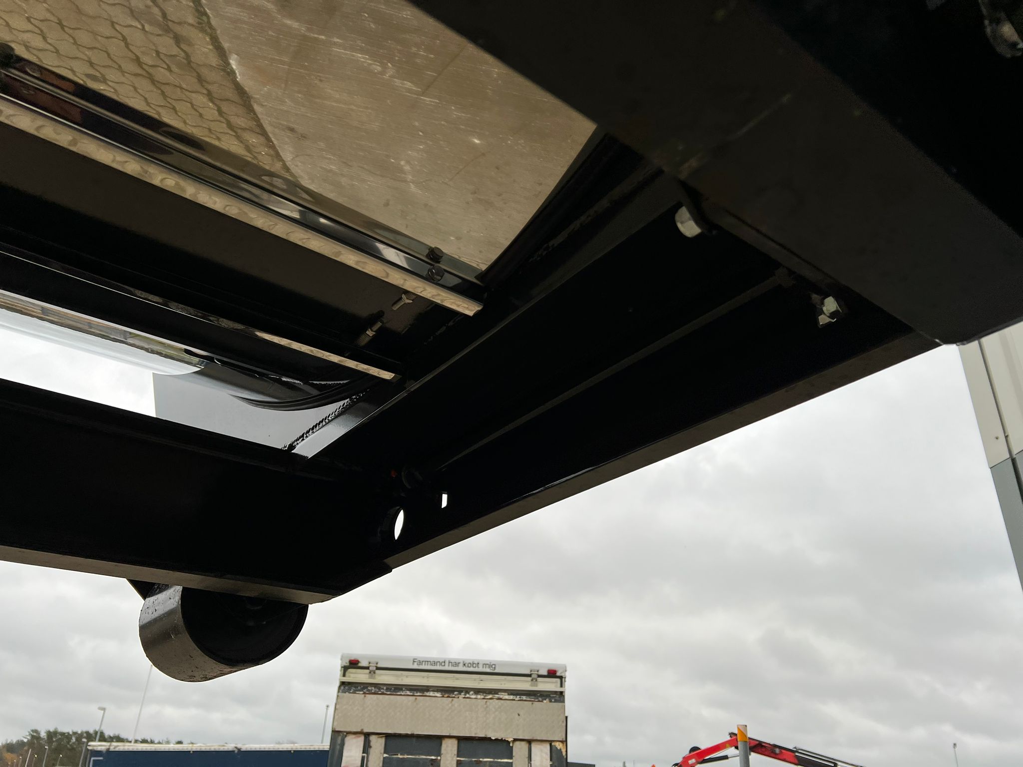 Hardox 450 3 mm stålindlæg i kassen - beklædt udvendig med 1 mm Rustfri plade - 1-delt bagsmæk som åbner nederste del ved brug af aut. bagsmæk - Lakeret i RAL 7021