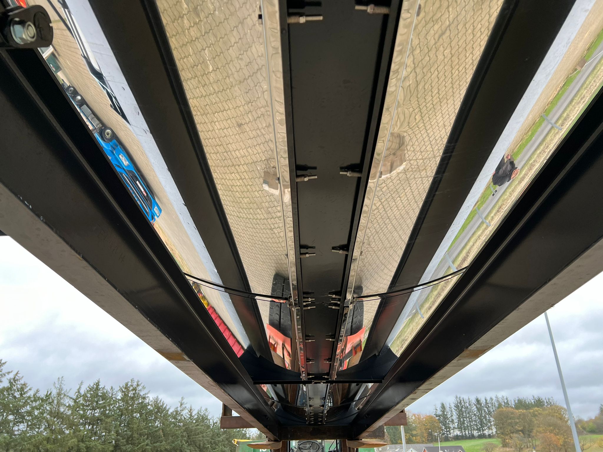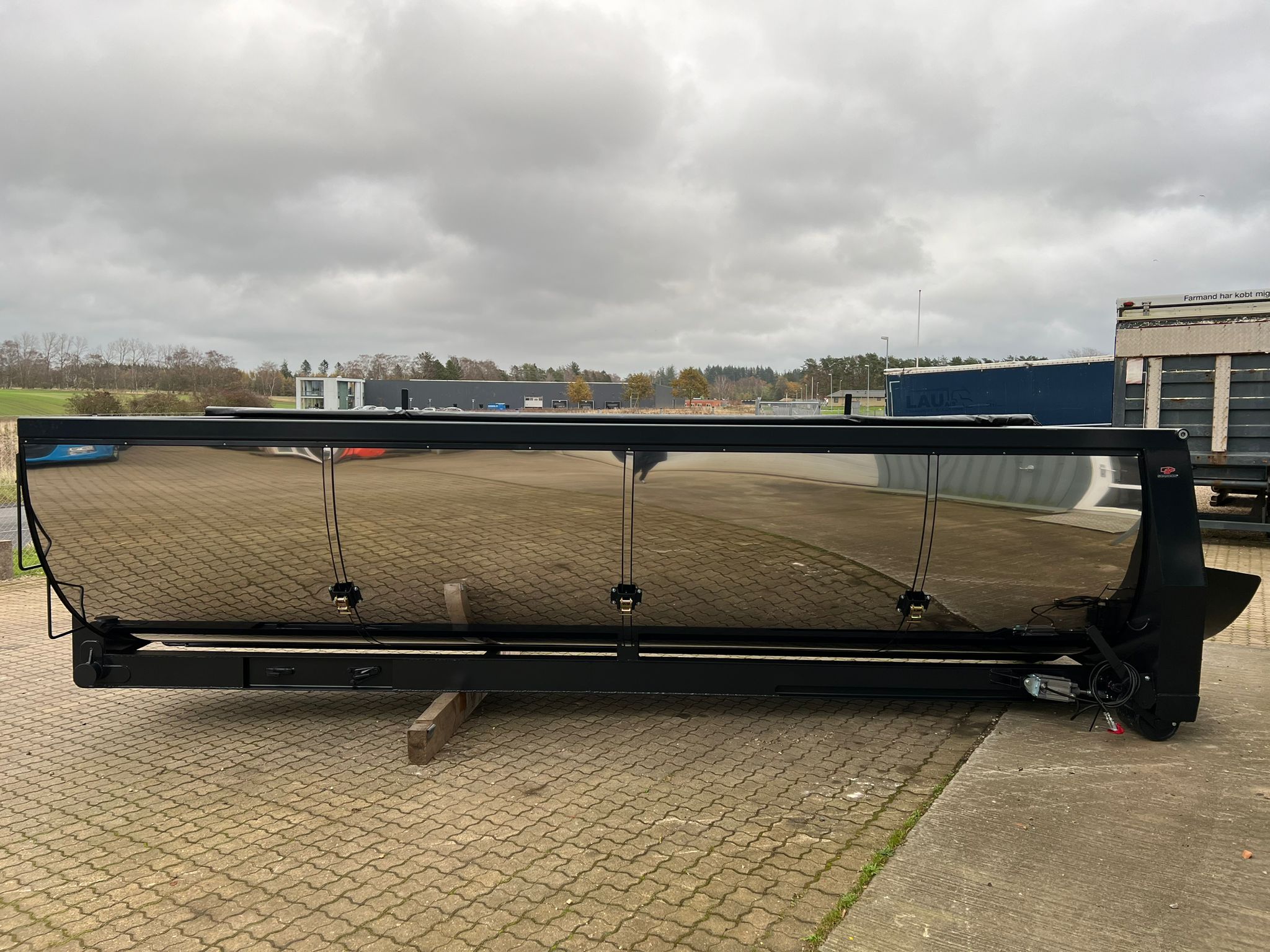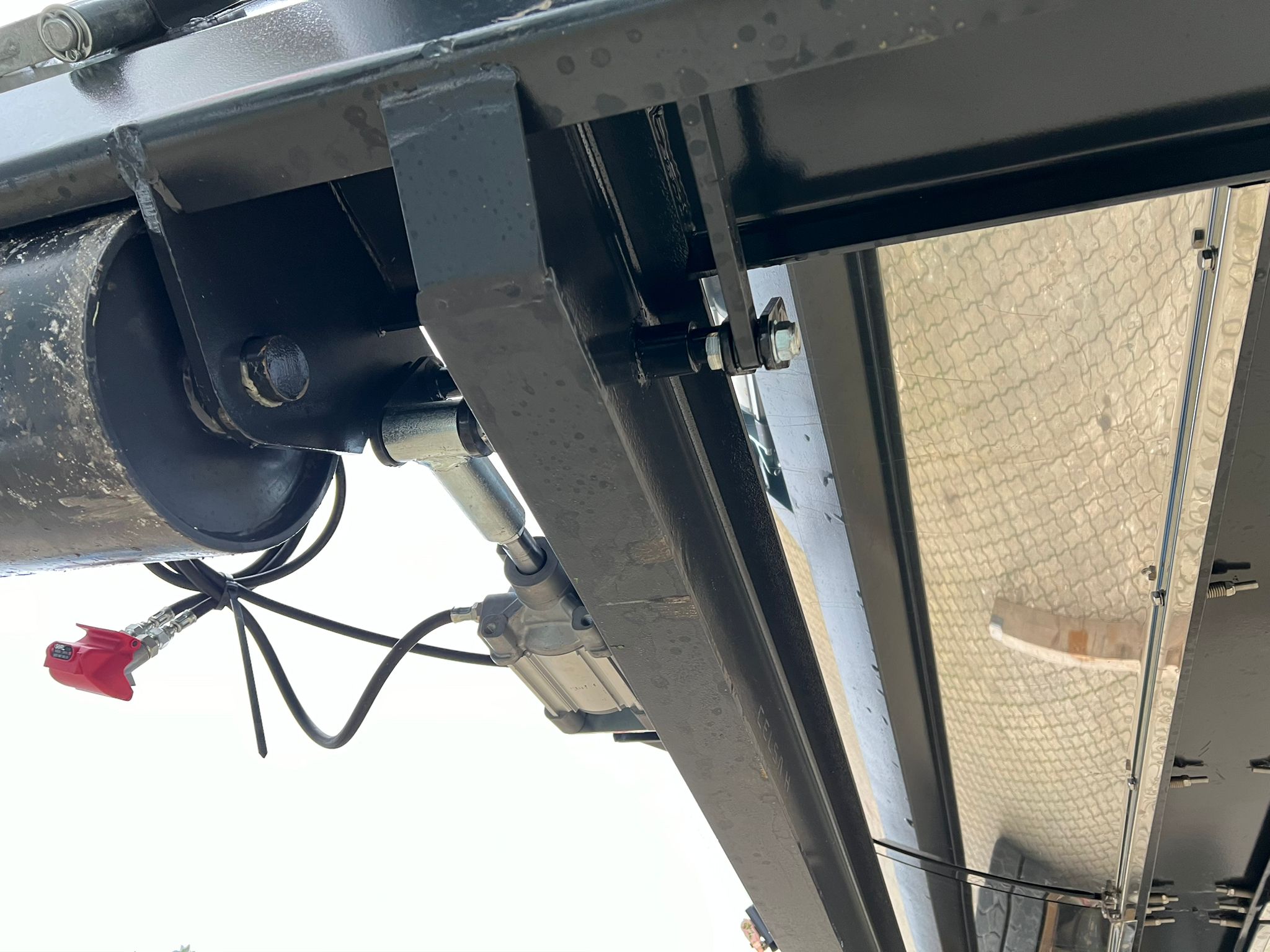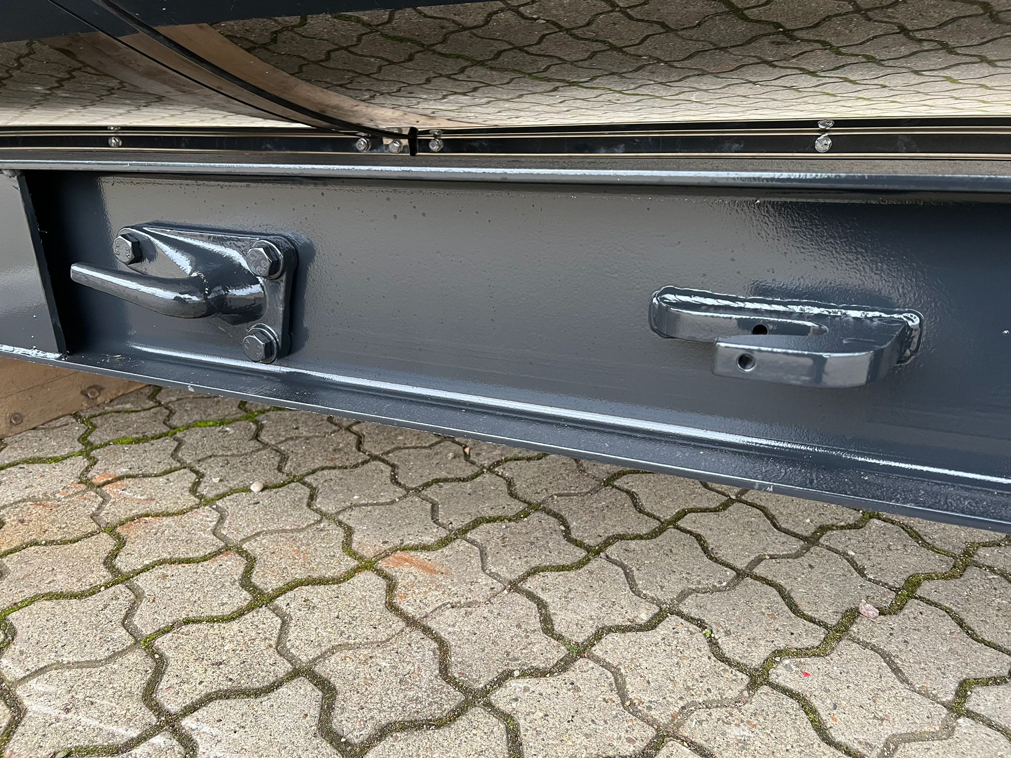 Hardox 450 3 mm stålindlæg i kassen - beklædt udvendig med 1 mm Rustfri plade - 1-delt bagsmæk som åbner nederste del ved brug af aut. bagsmæk - Lakeret i RAL 7021