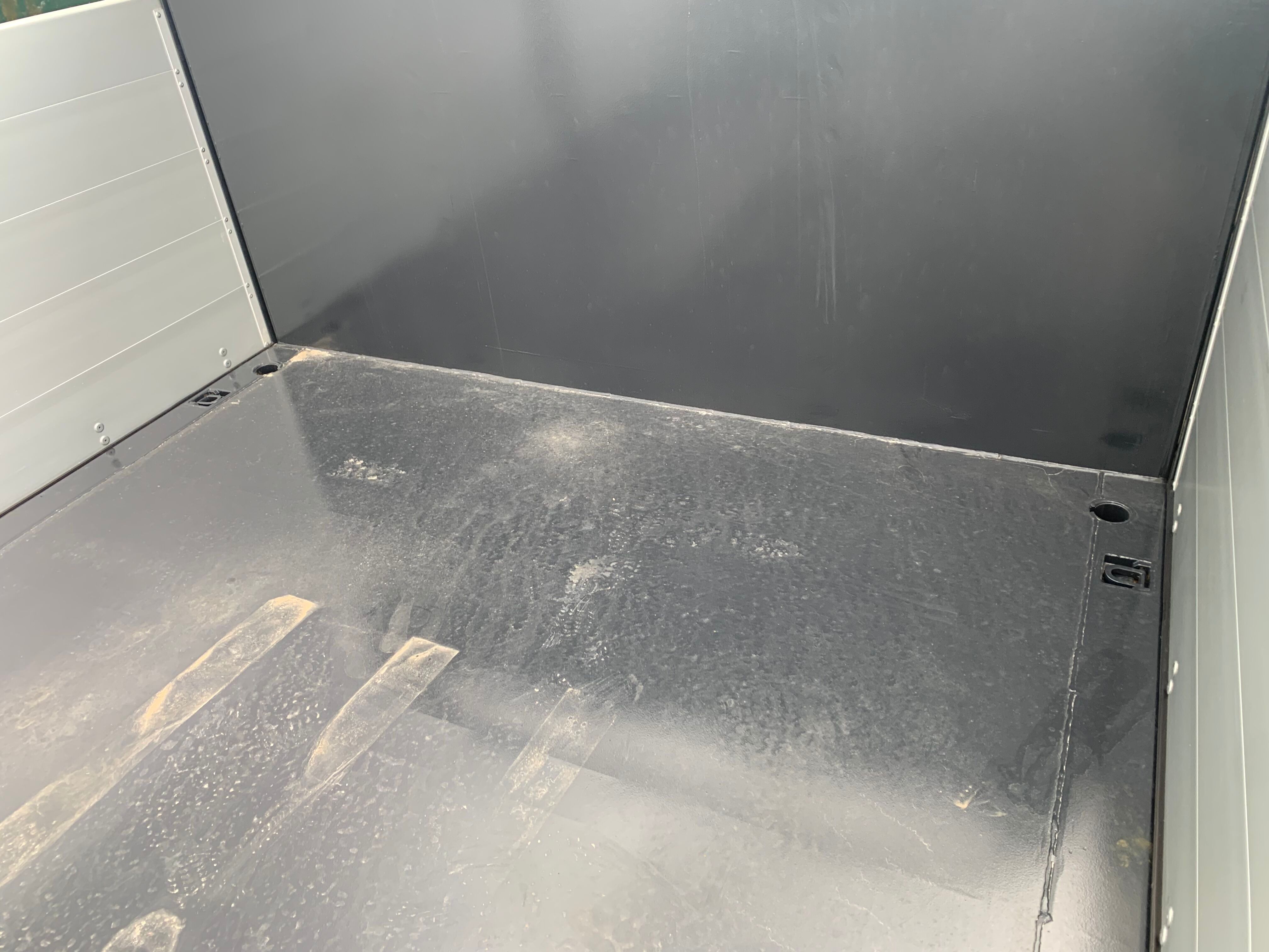 Indv. mål: L 5800 x B 2450 x H 990 mm - Der kan stilles en 20 fods skibscontainer i - Bundpladen er 4 mm Hardox 450 stålplade - Stålblæst og færdiglakeret i RAL 7021 - Forsmæk 1600 mm - Surringsringe i ladbund + på forsmækken.
