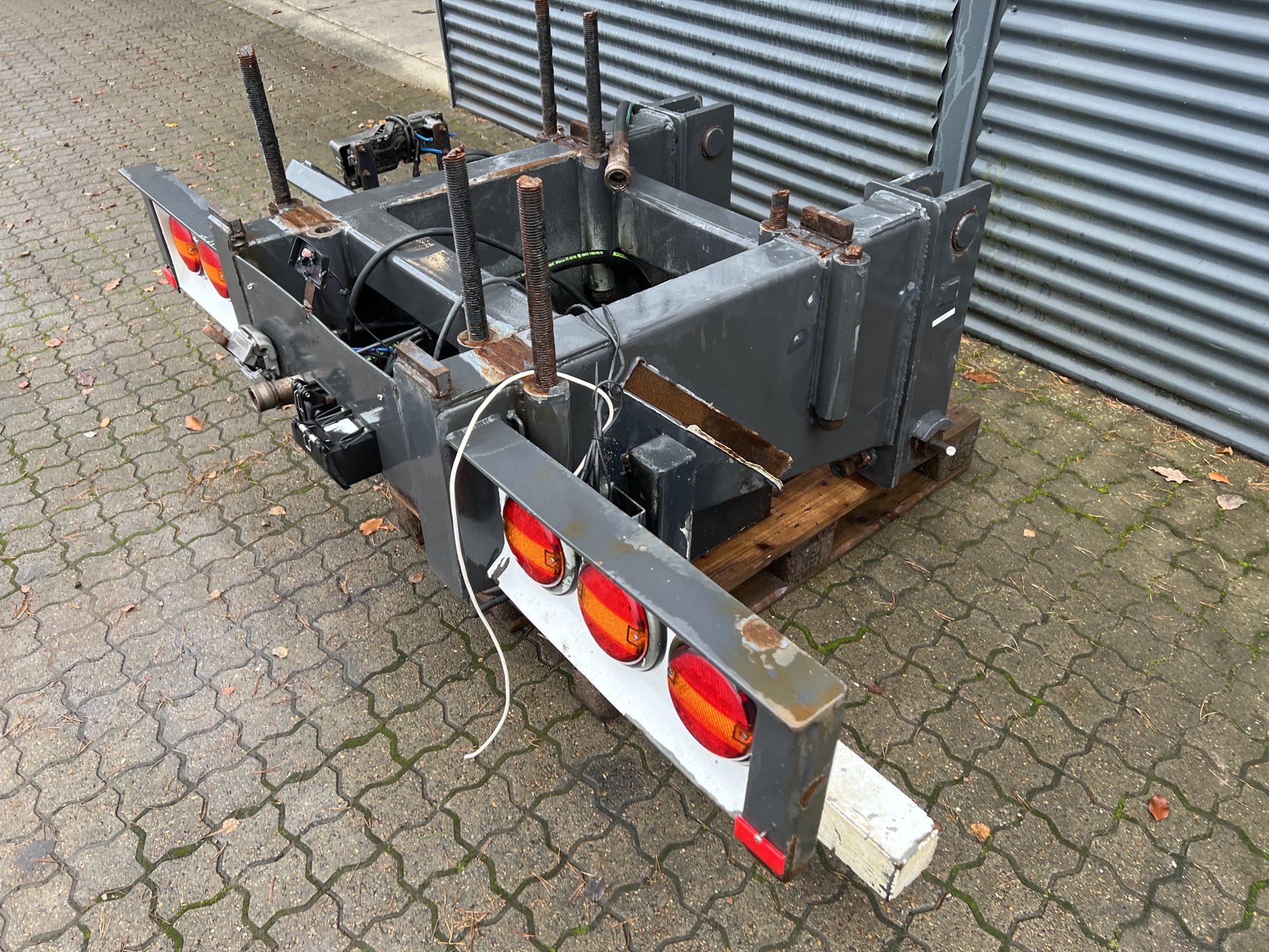 Aftagelig HMF 20 t/m krankonsol med HMF træk travers med D værdi - 190 kN - V -værdi 70 kN iht. HMF teknisk dokumentation - lys, luft og 1 strengs olie trukket med bagud - støttebens pladeophæng - Mål: 700 mm fra center til center mellem vanger - gaffelbredde xxx mm som går ind over kran ophængs beslag - 65 mm ophængs bolte - 480 mm fra nederste bolt til øverste - 1130 mm langt fra center bolt og bagud. - skurvognstræk - baglygter - værktøjskasse - grå med hvide lygtehuse trænger til sandblæsning