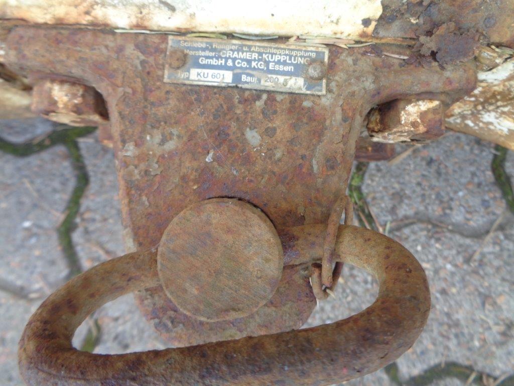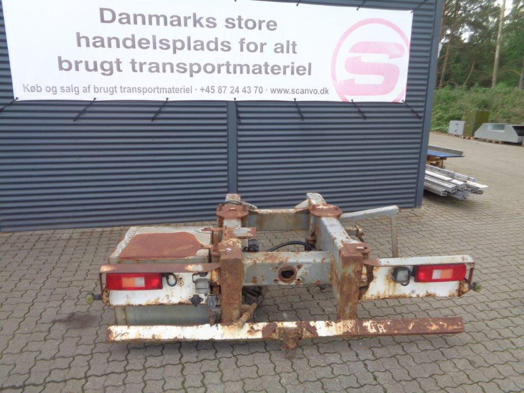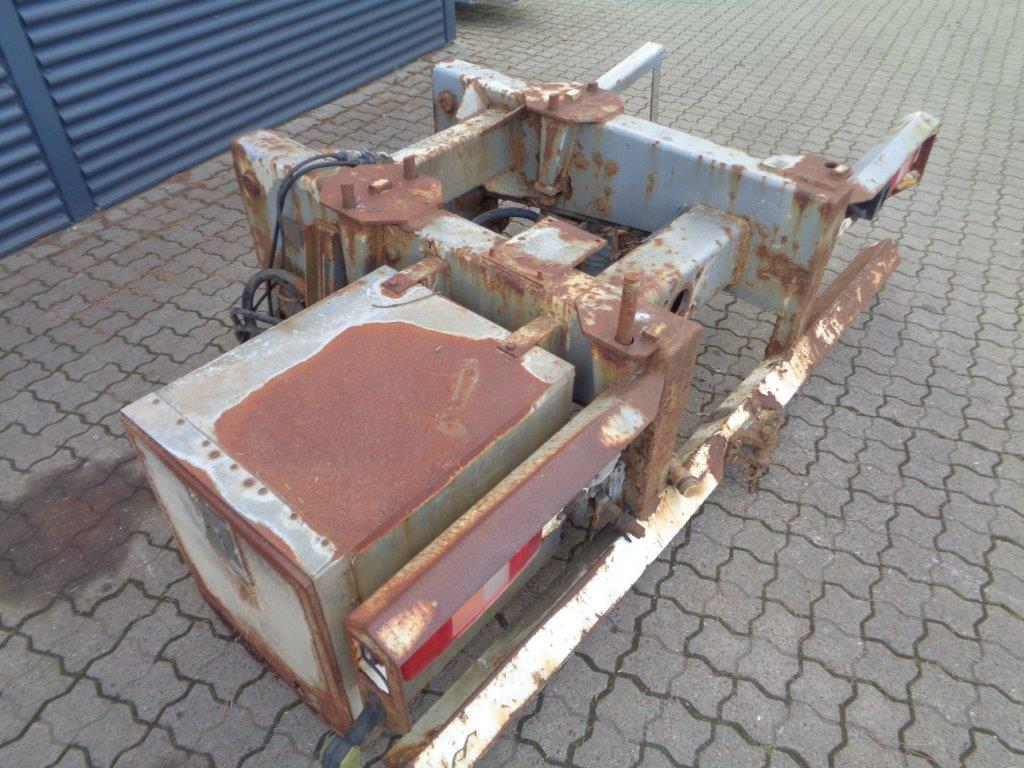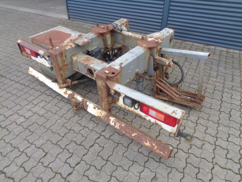 Aftagelig HMF 20 t/m krankonsol med HMF træk travers med D værdi - 190 kN - V -værdi 70 kN iht. HMF teknisk dokumentation - lys, luft og olie trukket med bagud - støttebens pladeophæng - Mål: 785 mm fra center til center mellem vanger - gaffelbredde 700mm som går ind over kran ophængs beslag - 60 mm ophængs bolte - 475mm fra nederste bolt til øverste - 1350 mm langt. - skurvognstræk - baglygter - værktøjskasse - grå med hvide lygtehuse trænger til sandblæsning