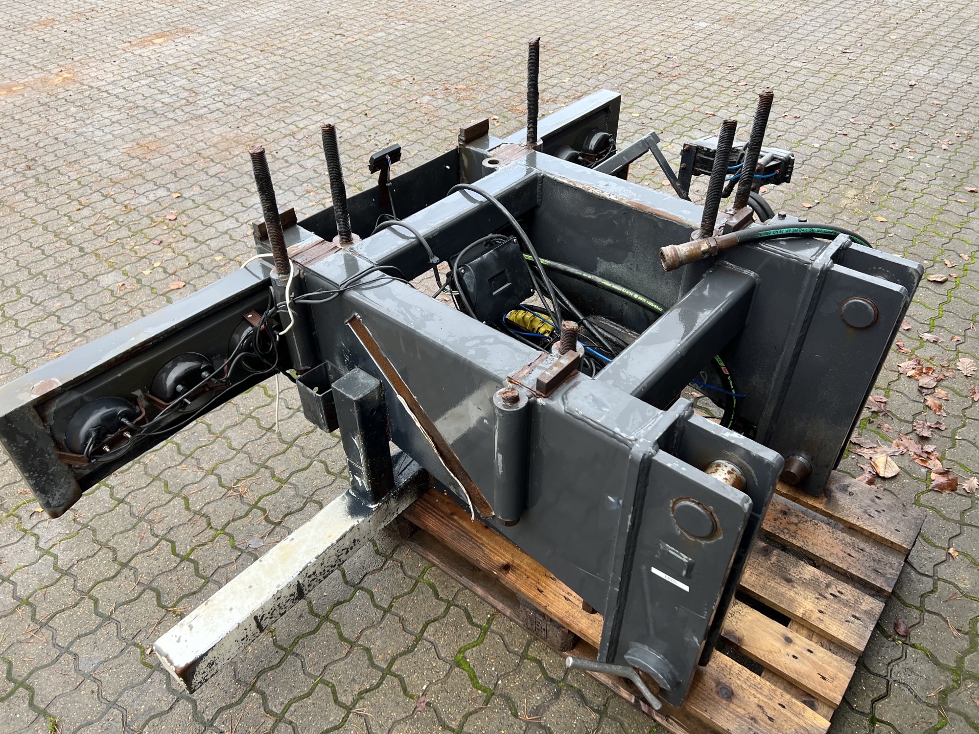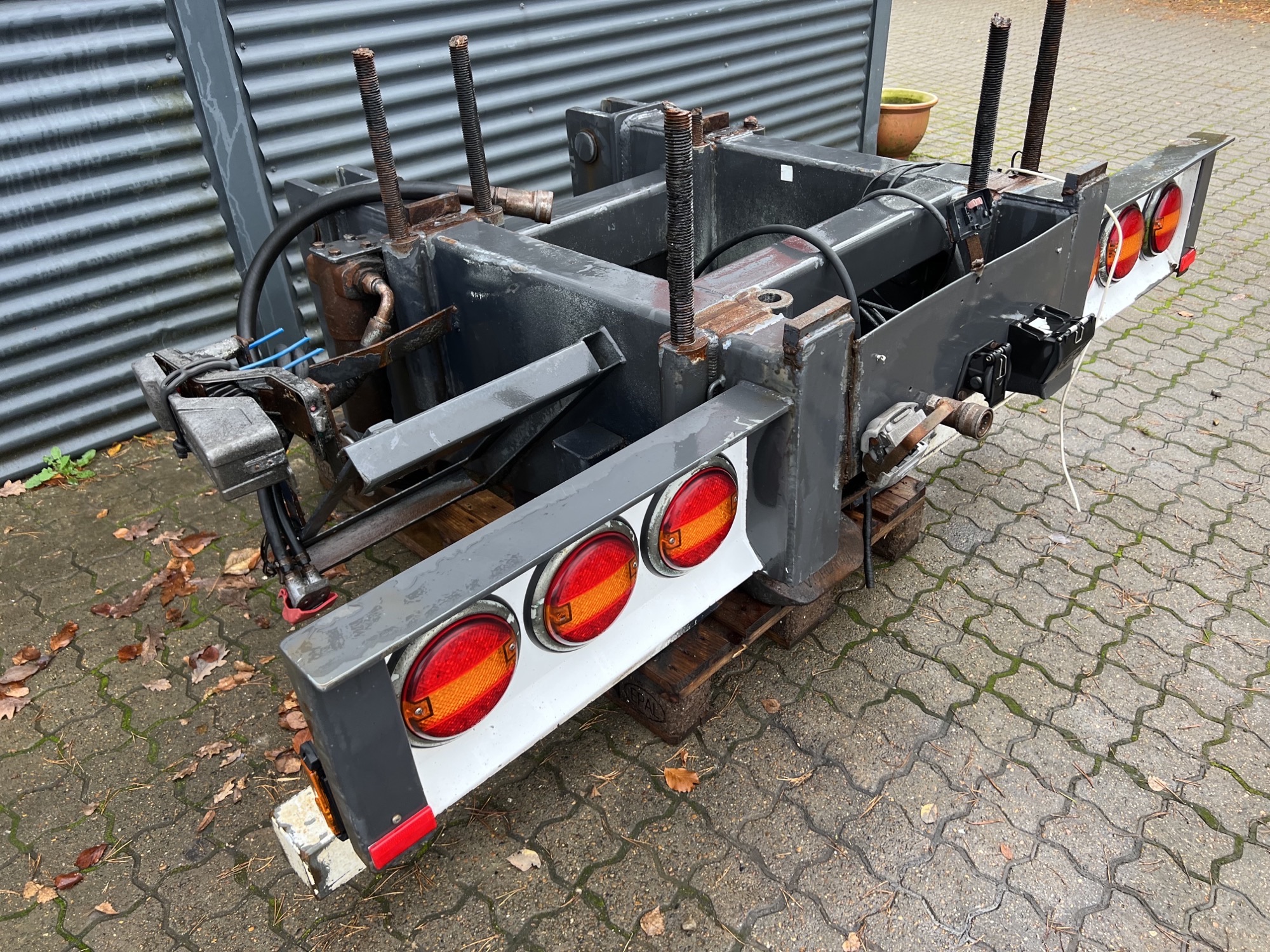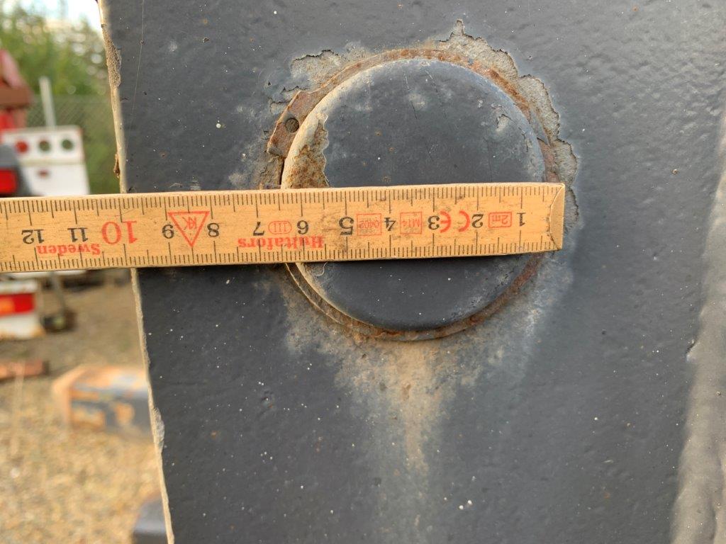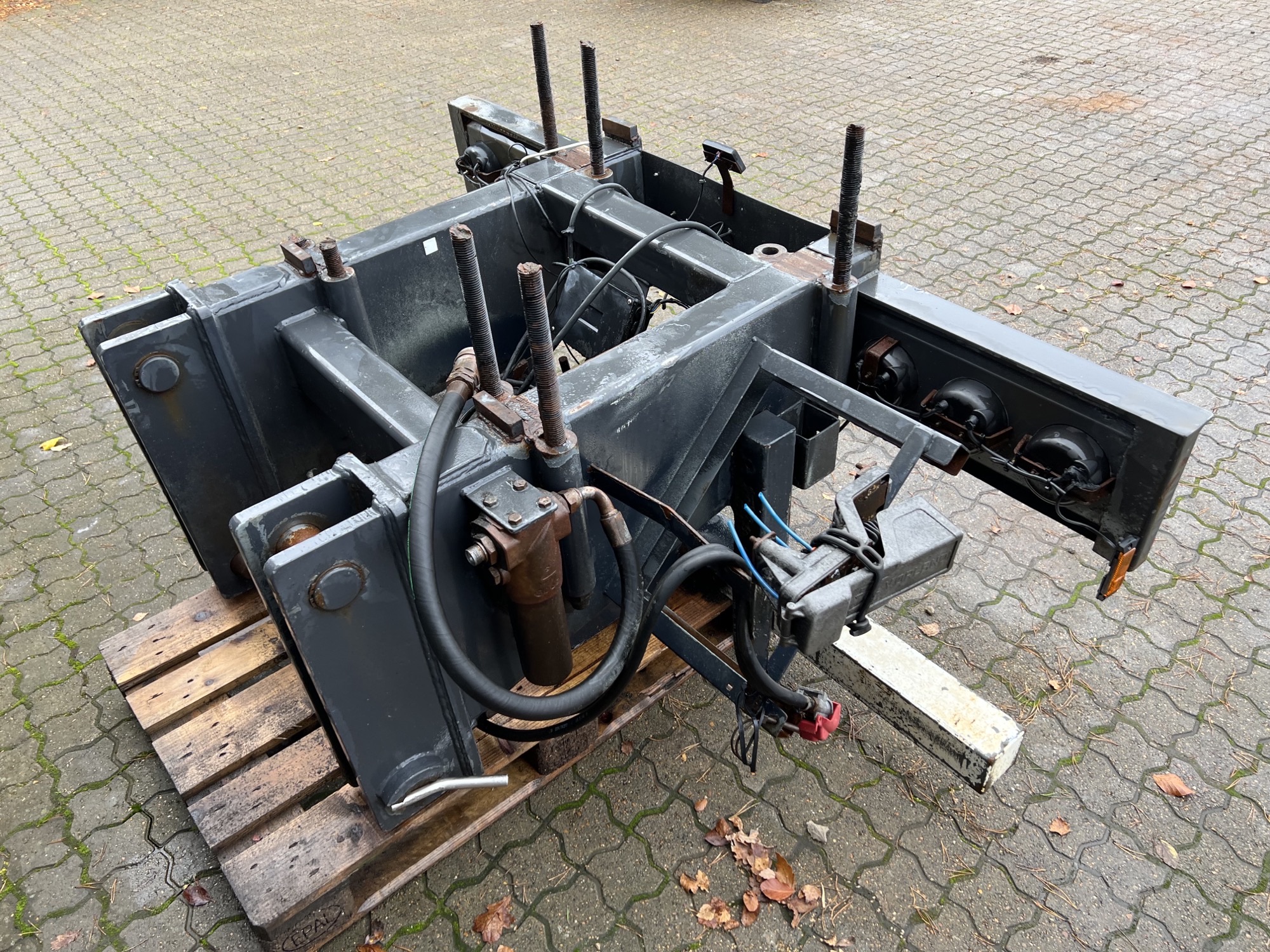 Aftagelig HMF 20 t/m krankonsol med HMF træk travers med D værdi - 190 kN - V -værdi 70 kN iht. HMF teknisk dokumentation - lys, luft og 1 strengs olie trukket med bagud - støttebens pladeophæng - Mål: 700 mm fra center til center mellem vanger - gaffelbredde xxx mm som går ind over kran ophængs beslag - 65 mm ophængs bolte - 480 mm fra nederste bolt til øverste - 1130 mm langt fra center bolt og bagud. - skurvognstræk - baglygter - værktøjskasse - grå med hvide lygtehuse trænger til sandblæsning
