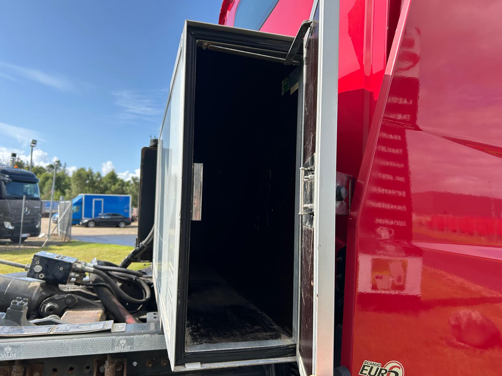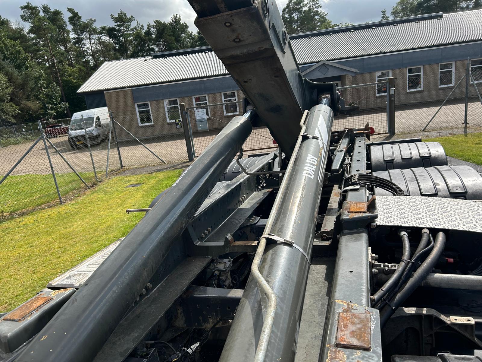 DALBY kroghejs 20 ton med knækarm - 5300 mm fra centrum krog til centrum ruller ibag + 300 mm til bagkant kofanger - kan køre med max 6300 mm container kan øges ved brug af udskuds kofanger med ca. 600 mm - tværgående værktøjskasse bag førerhus