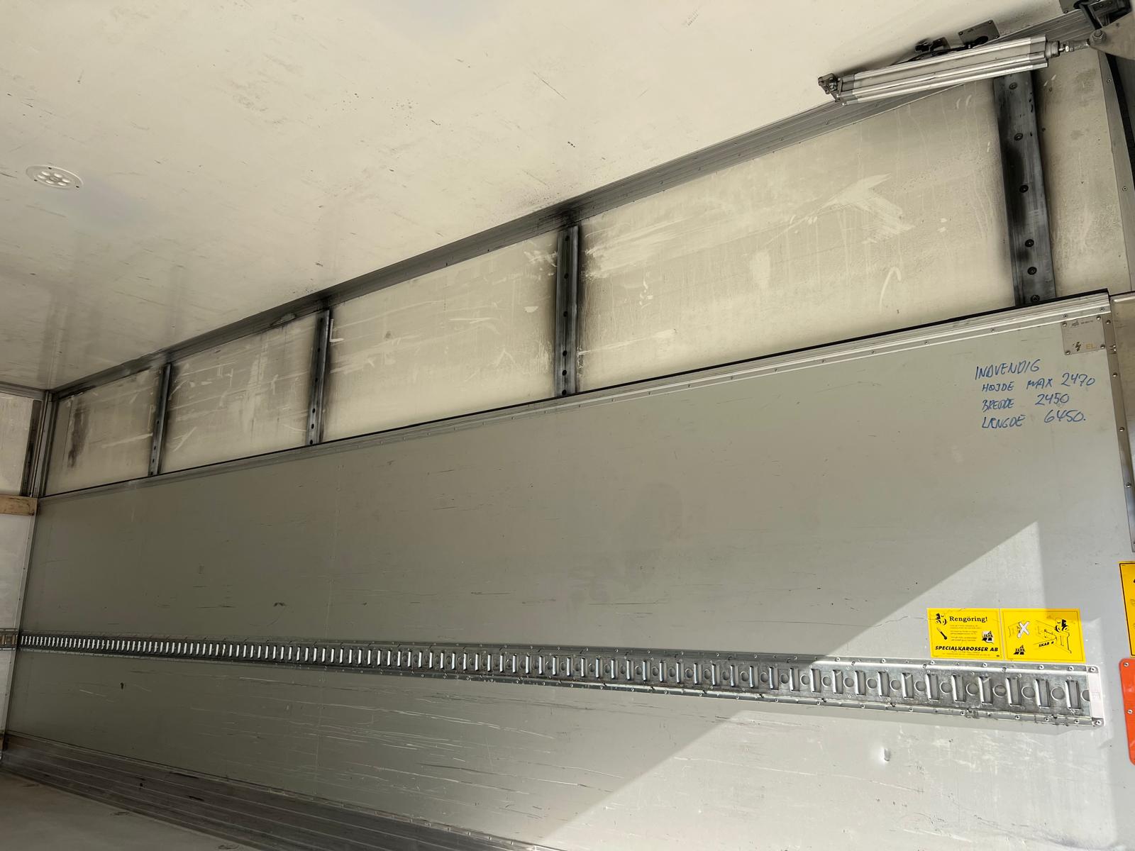 SKAB kvalitets glasfiber kasse model BTIH indvendige ladmål  : Længde 6350 x Bredde 2480-*/2456 x Variabel højde fra 1740 til 2490 mm - */indfældet binderække - Isolering 100 mm i forvæg - 50 mm i taget - 40 mm i væge kan laste 15 Europaller - bak kamara -