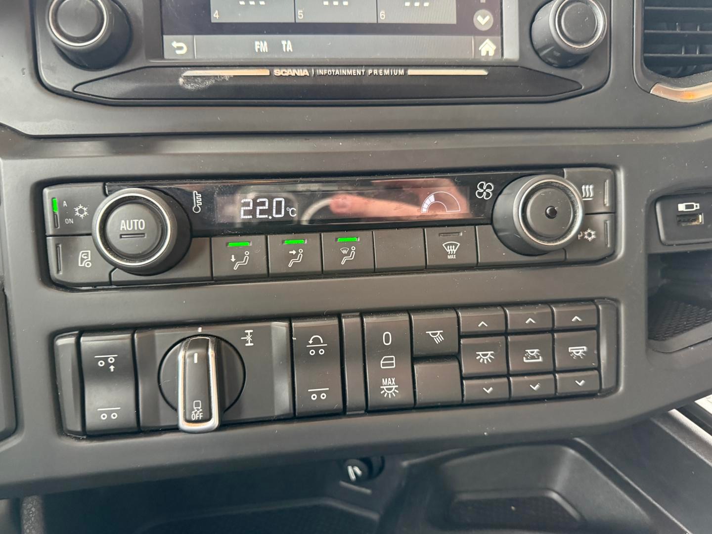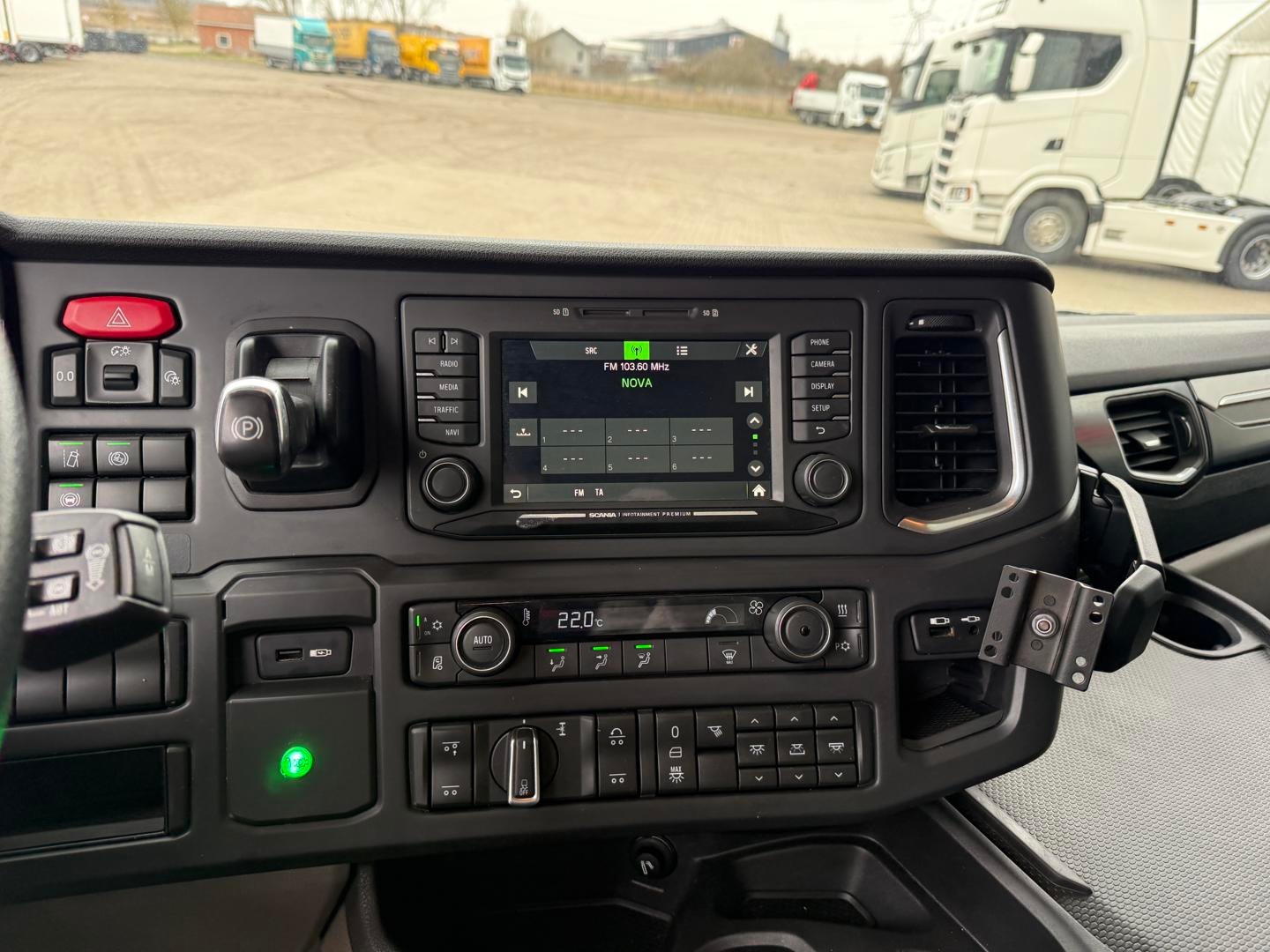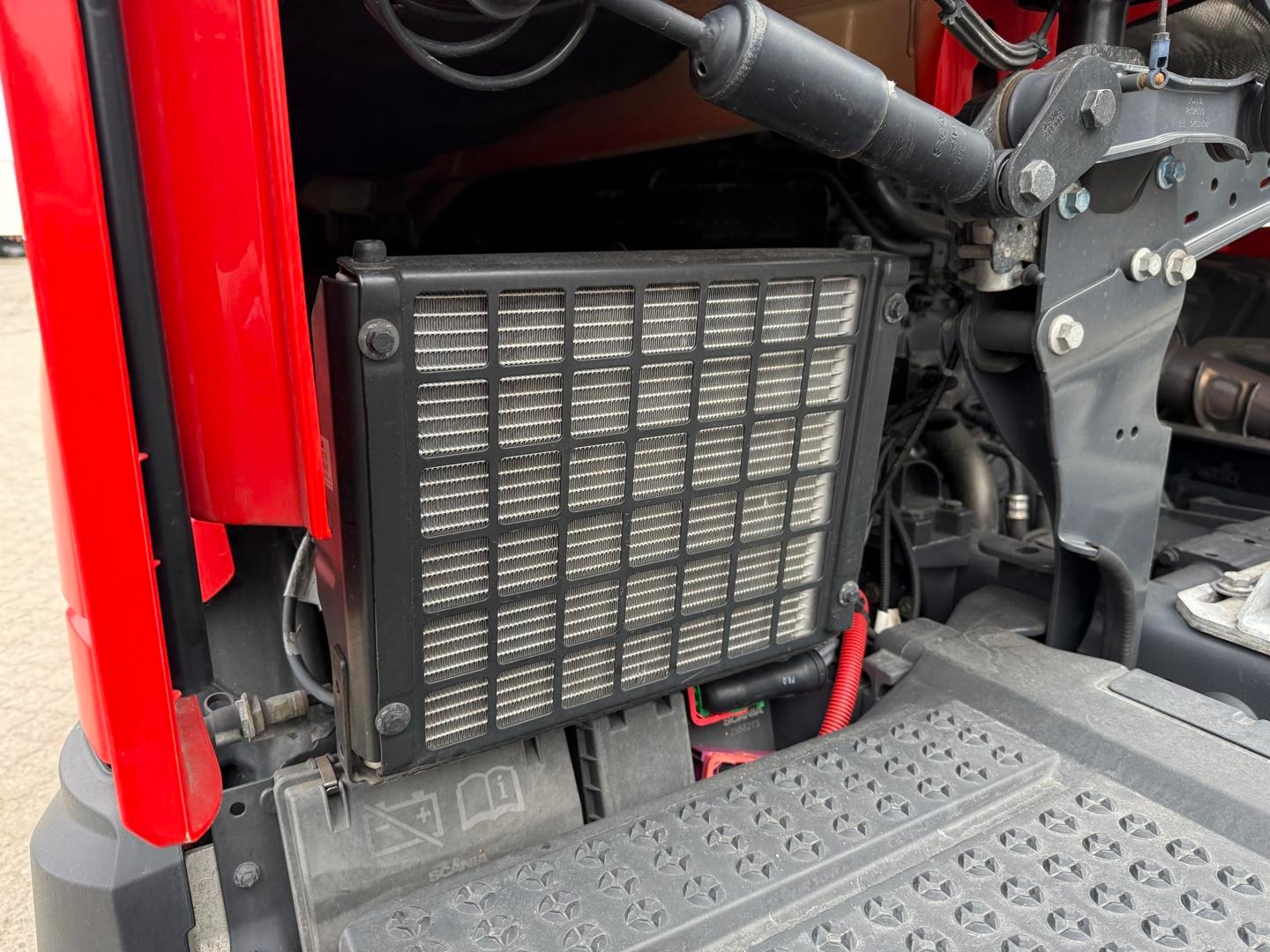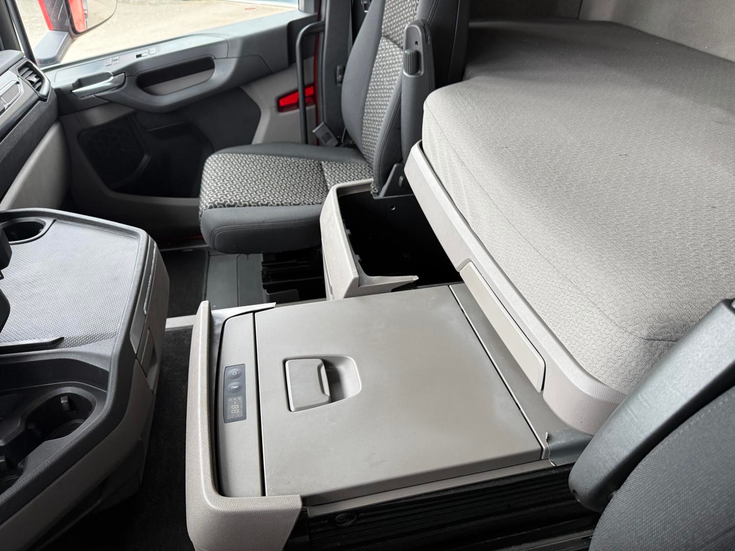 Kabinen CR20 H - 2 køjer - kabinevarmer - klimaanlæg - luftaffjedrede sæder - radio - walkie - køleskab - sporassistent, lastindikator, ACC og adaptiv fartpilot - Scania stand klima / air cooler - fabriks lakeret førerhus i Spicy Red (RAL3020 CM)