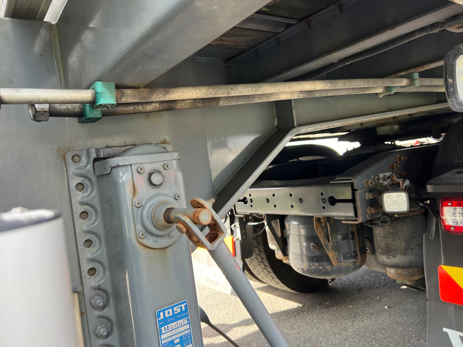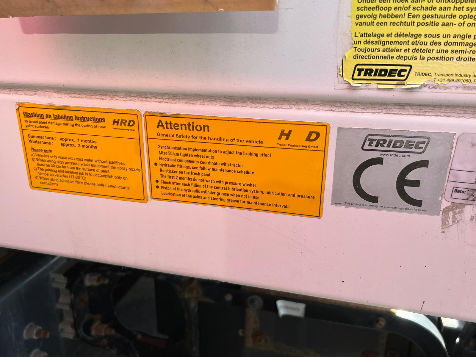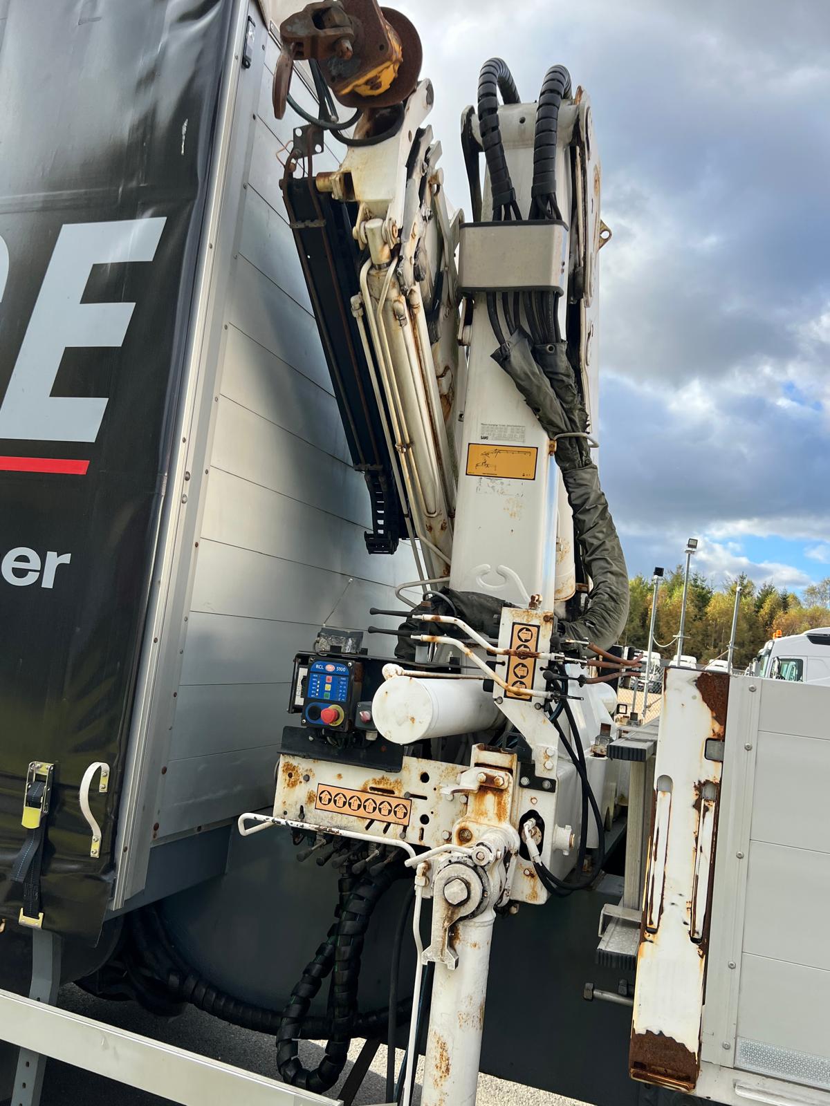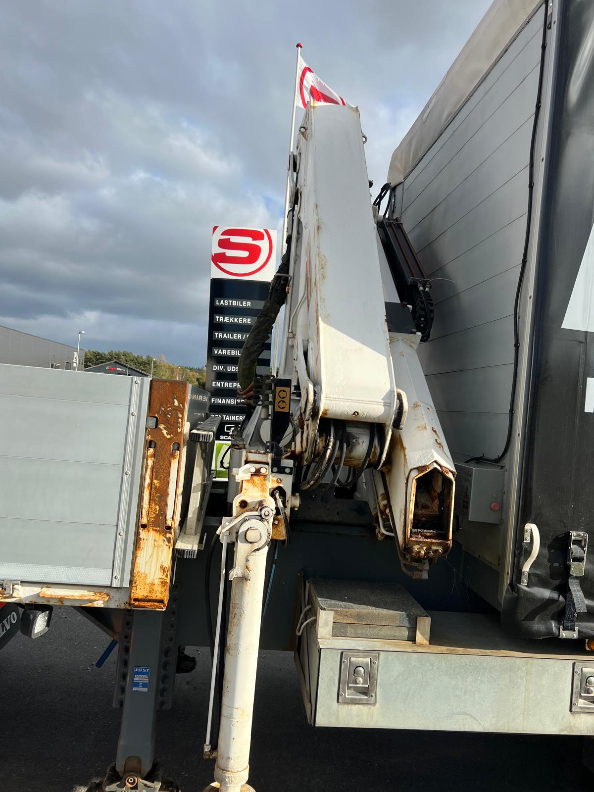 der kan kobles hydralik fra trækkeren eller der kan køres på 380 volt strøm via en hydraulik station som er monteret forret inde i gardinlad - kranen har ingen typeplade med er ældre end traileren men fremtår i god stand