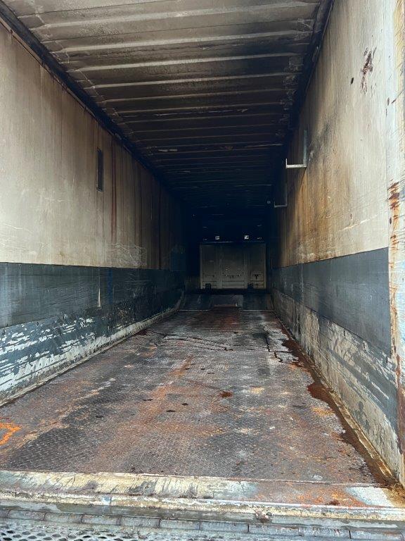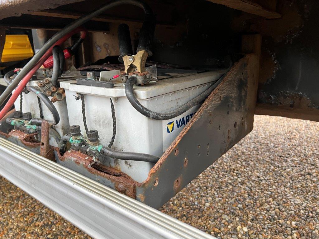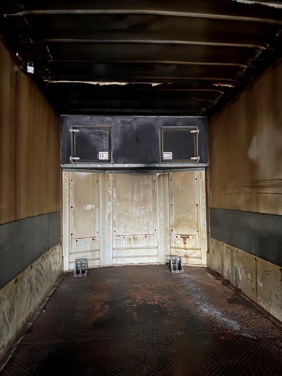 Kassen har skrå hjørne på forsmæk og dermed er længden øget med 250 mm på midten - indvendige ladmål : L  13600 x  H 2900 x  B 2470 mm - rapo L = 3900 mm + stål opkørsels ramper ned en til plan ladbund L  9700 =  mm - ladbund højde 900 mm  el- betjenet stor galvaniseret læsse rampe = L 2900 x B 2500 mm - træ med stålprofiler + jerndør oven på - ståltag - indvendig lys - ipå forvæg indvendig er der øverste fremstillet aflægger rum med låger - kassen sider er fremstillet i plywood og monteret på en kraftig stålramme ca 600 mm over ladbund - ladsiden i venstre for trænger er rep udvendig - batteristation - værktøjskasse -