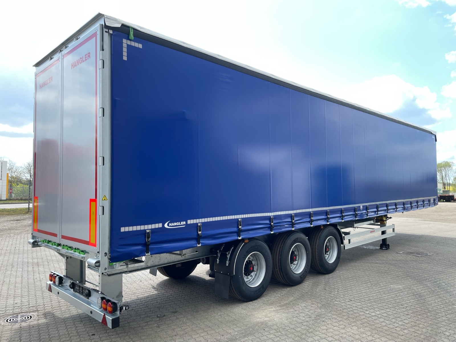 Vi kan også tilbyde ny 3 akslet Hangler Nordic model trailer med bagaksle trukket bagud og selvsporende 3. aksel eller en nyere brugt 13,6 mtr gardin trailer