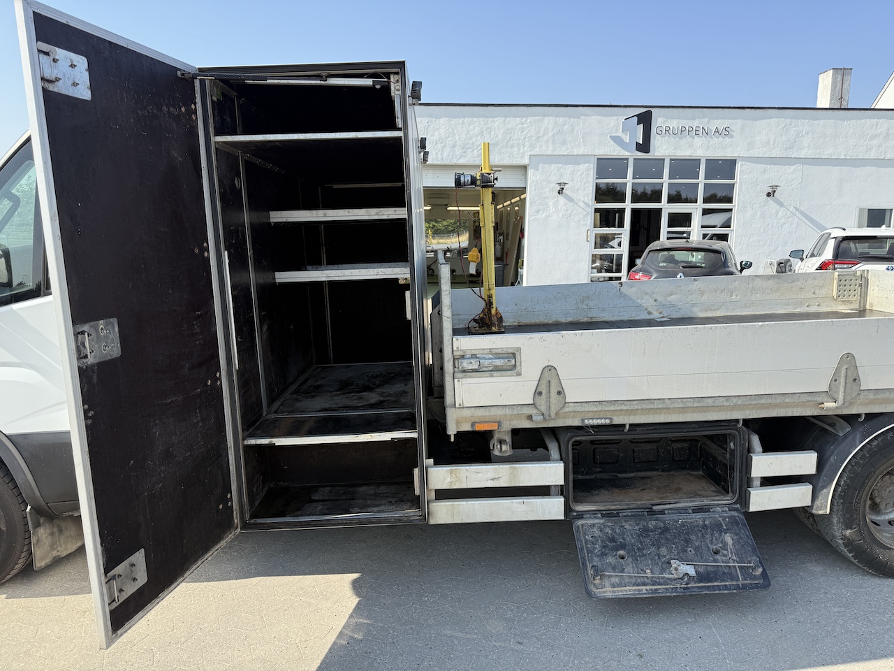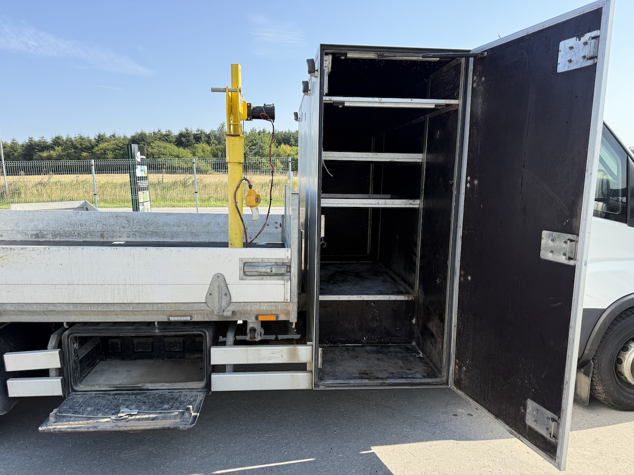 El-kabel lift max 500 kg. med fjernbetjening, stort værktøjsskab bag førerhus med døre i begge sider samt plast værktøjskasser i begge sider. Velholdt og klar til drift.